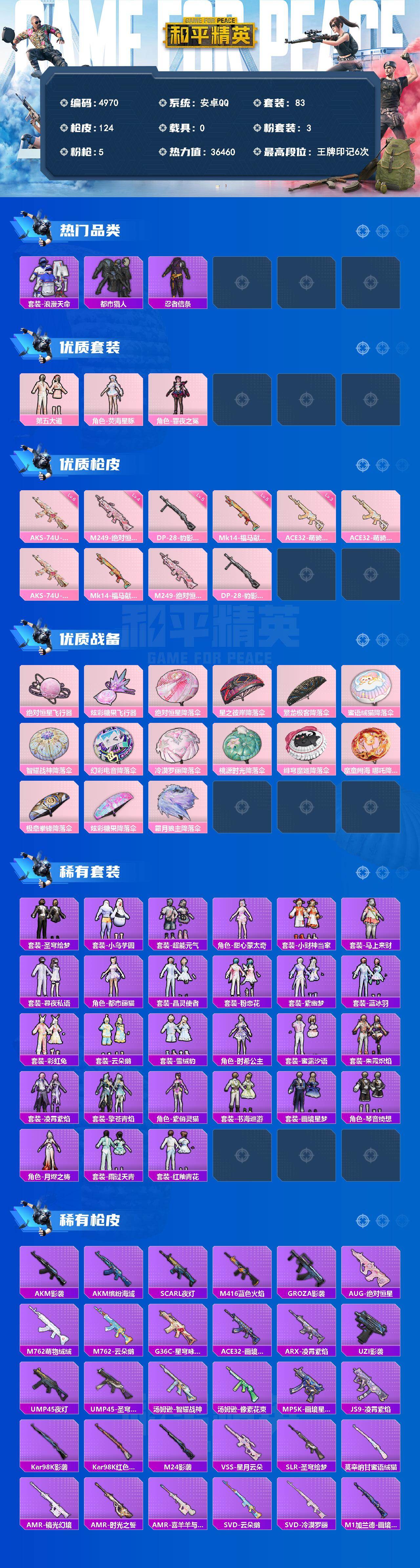 【粉色枪皮等级】:ACE32-萌骑漫游(三级),AKS-74U-星穹咏叹调(六级),Mk14-福马献瑞(五级),M249-绝对恒星(四级),DP-28-豹影疾电(五级)