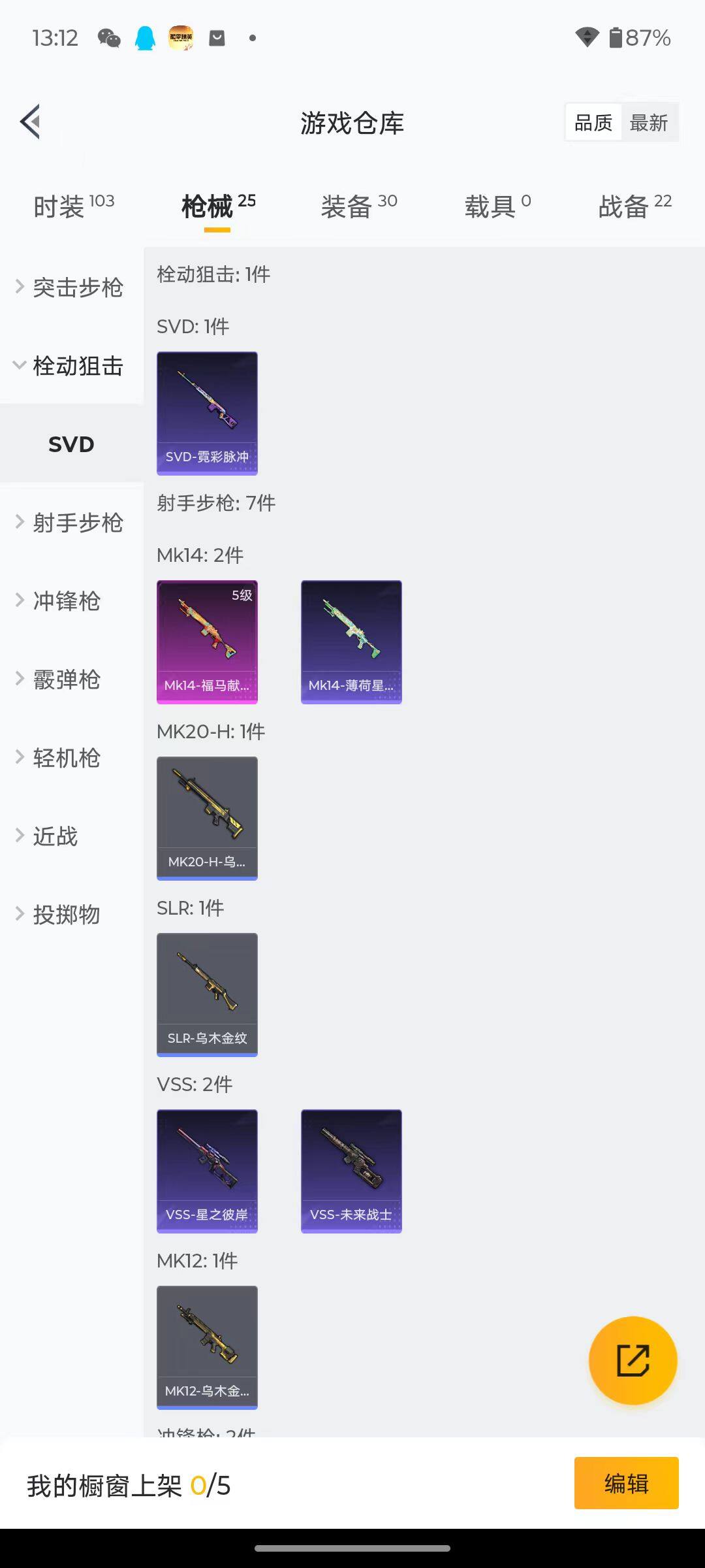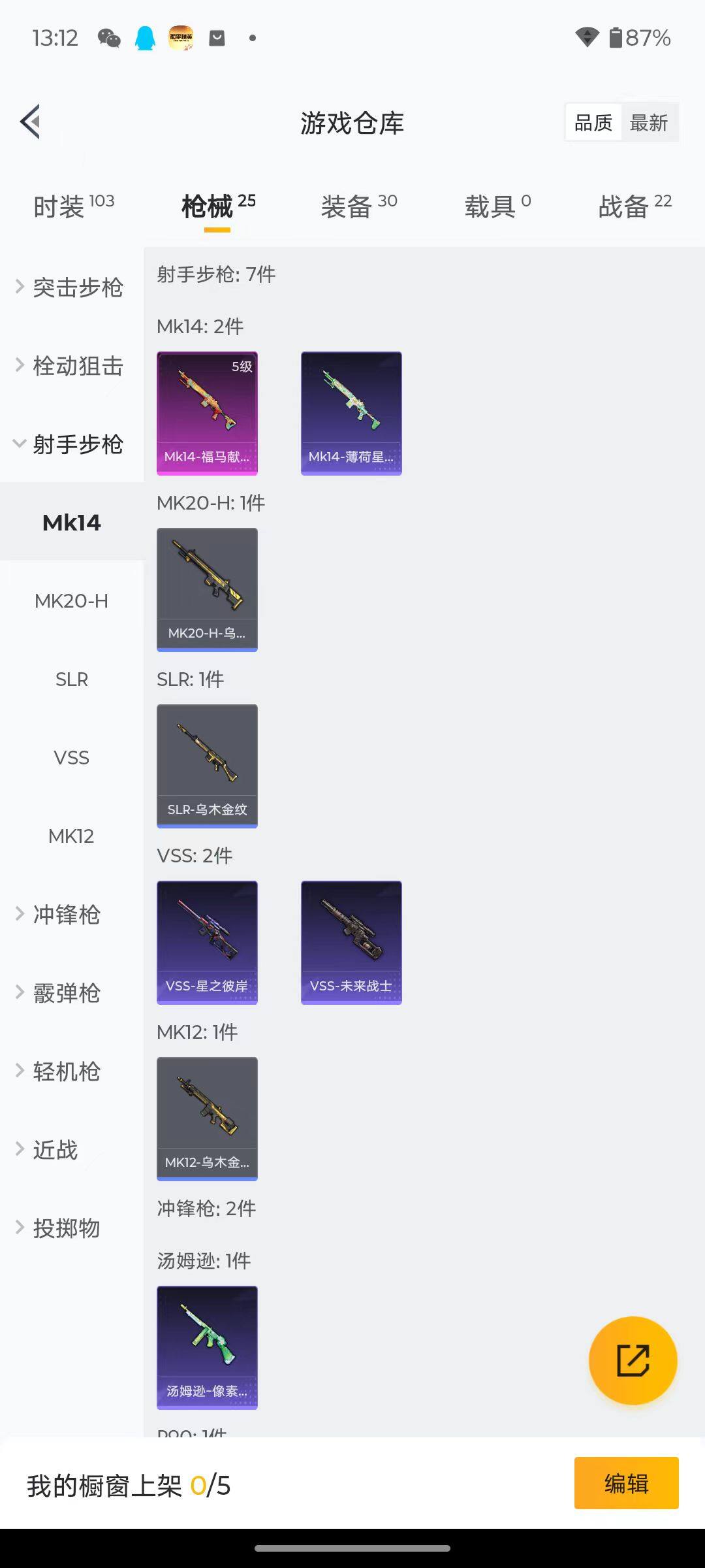 20套装/枪械3/装备30/战备22/王牌印记1/热力值6165/二级ACE32-萌骑漫游/五级Mk14-福马献瑞/二级DP-28-豹影疾电/忍者信条/ACE32-萌骑漫游/Mk14-福马献瑞/DP-28-豹影疾电/极限特训降落伞/套装-马上有钱/AKM-龙的传人/SCAR-L-炫彩节奏/AUG-耀粉歌者/汤姆逊-像素花束/VSS-星之彼岸/VSS-未来战士/DP-28-彩虹符号/军械专家/套装