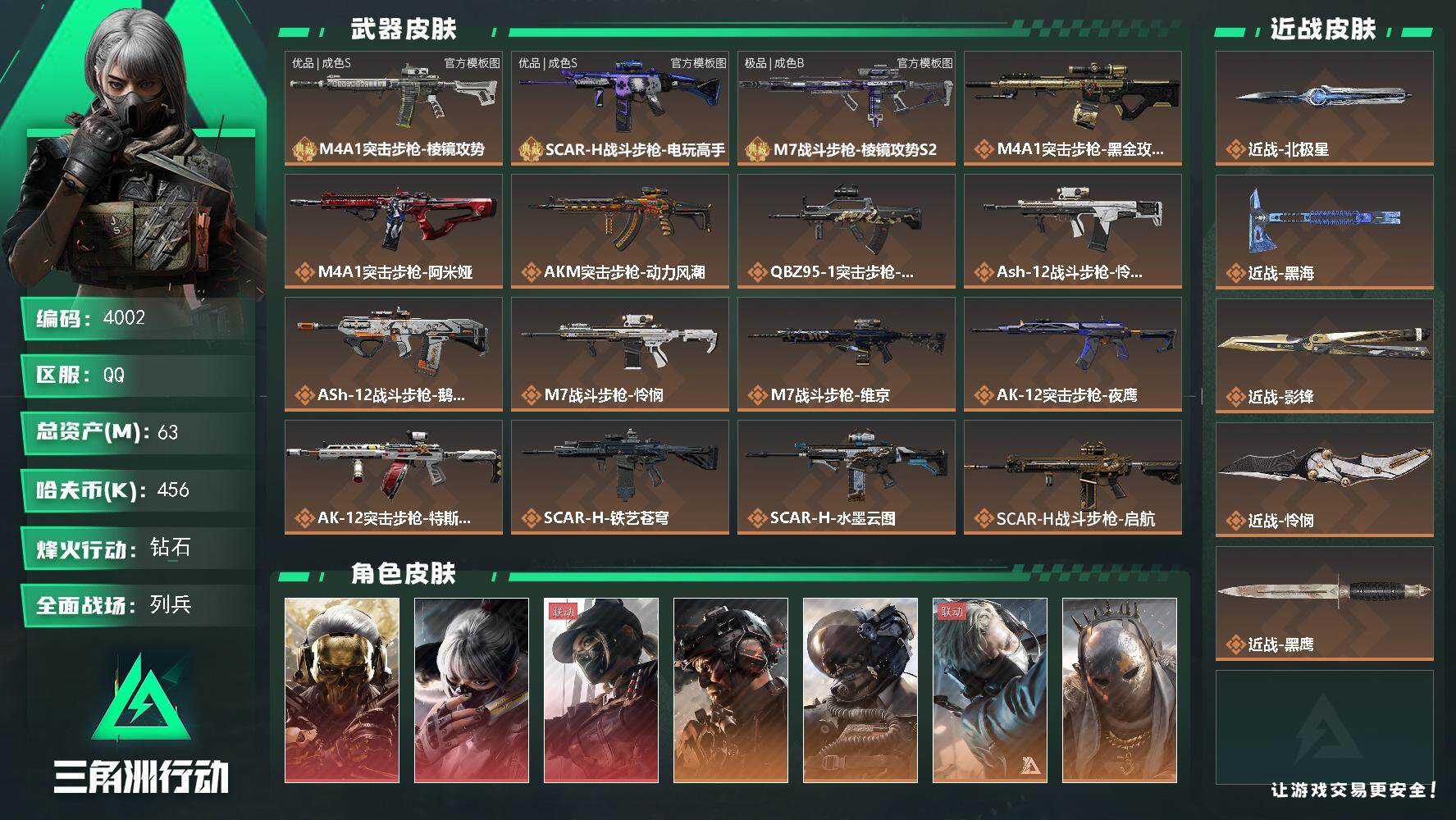 {特价出售}《 赛季九格4月16号到期》等级:60总资产:137.1M 纯币5885K 红皮:蚀金玫瑰,凌霄戍卫,水墨云图, 刀皮: 暗星,信条,怜悯 砖皮: AUG优品B冰,M7优品S,ASYal优品B,腾龙优品C 特勤处:仓库7,训练7,靶场6