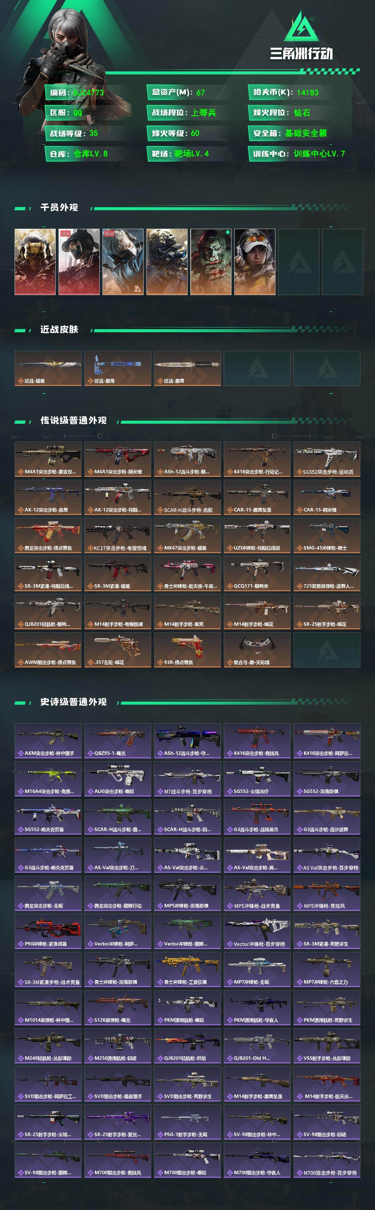 总资产(M):67M/哈夫币(K):14183K/ 传说枪皮数:29/全面战场等级:35_段位:上等兵/烽火地带等级:60_段位:钻石