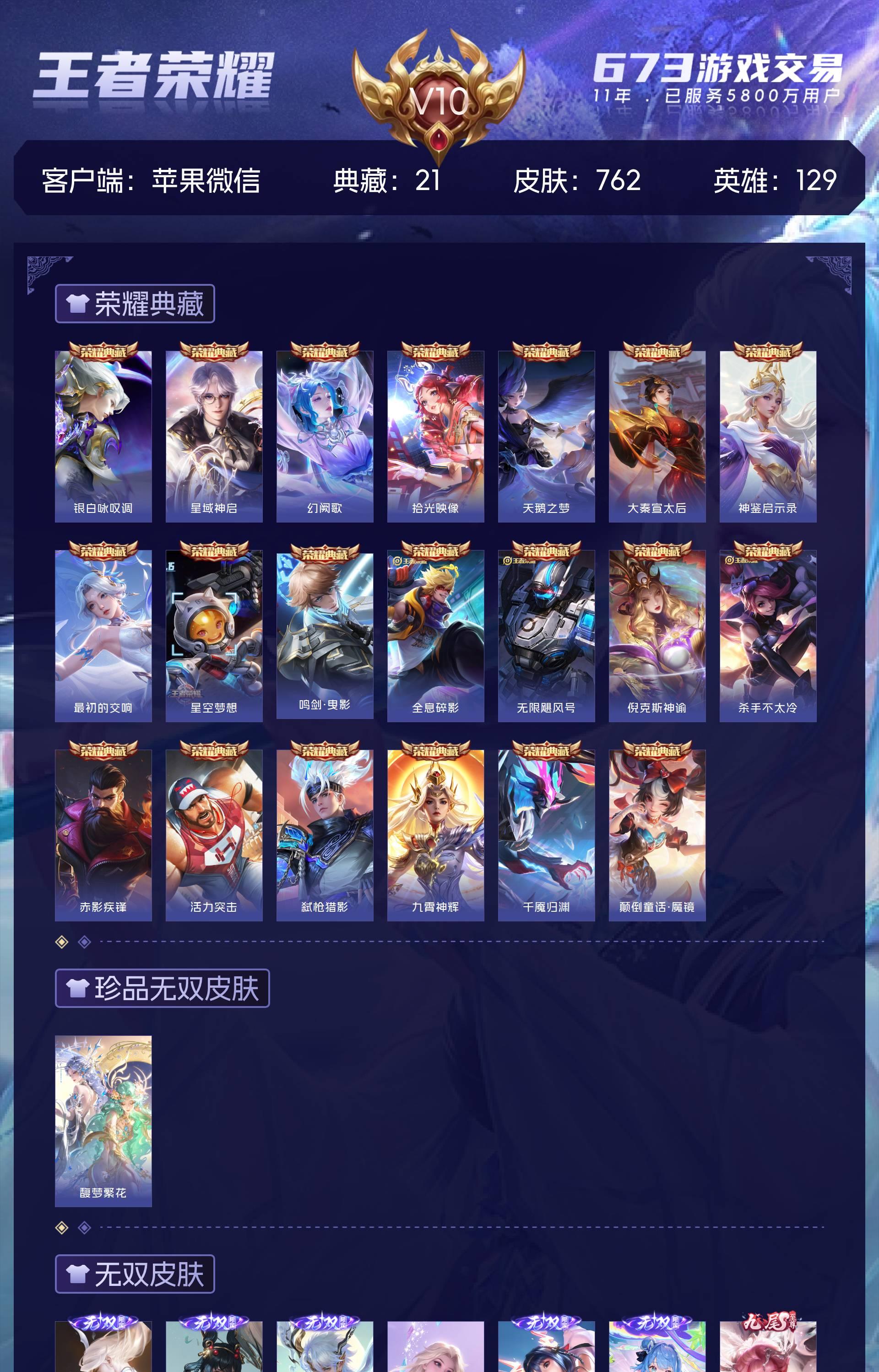 苹果微信-皮肤762,荣耀典藏全满,一个小兵皮肤,极品灵宝(附带金铲铲)