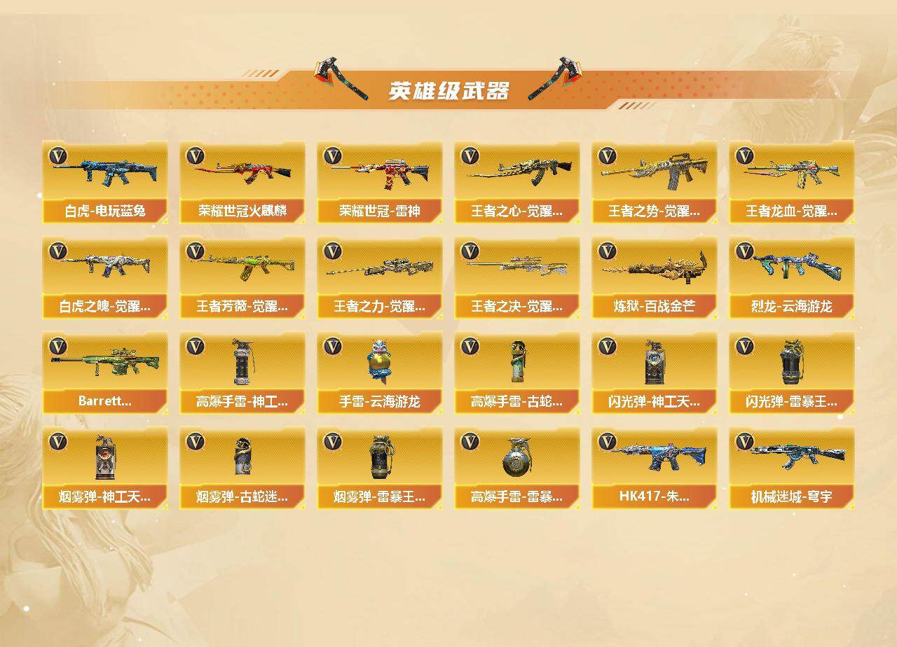 【热门武器】:传说幽冥,G36C-幻影,QBZ03-金色蔷薇,HK417-朱雀,M200-幻神,金色蔷薇-古蛇迷踪,修罗-古蛇迷踪,M200-竞技荣光,荣耀世冠-火麒麟,荣耀世冠-雷神,白虎-电玩蓝兔,柯尔特-冠军之特,Kar98K-星神,炼狱-迷你小钢,M4A1-黑骑士,汤姆逊-烈龙*2,RPK