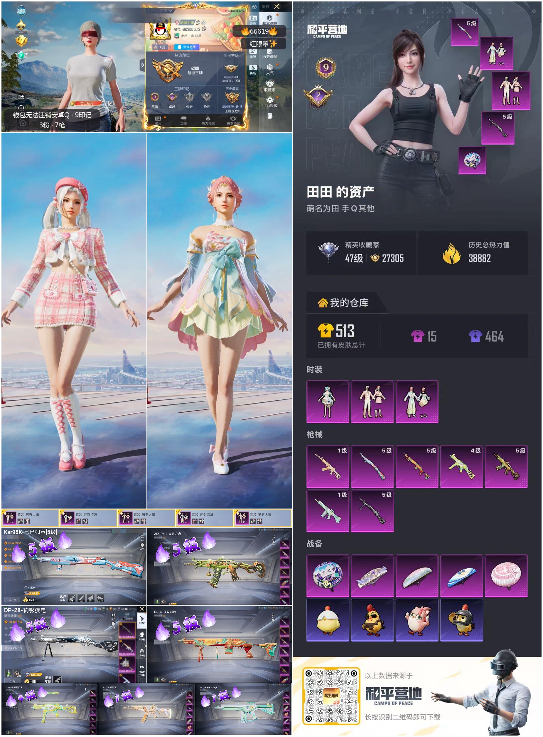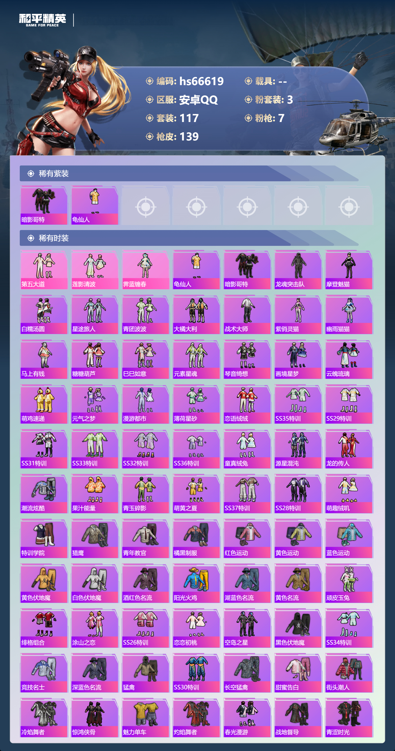 hs66619 安卓手Q-9王牌印记-3粉装-7特效枪-38882热力值-117套装-139枪皮-2卓越印记