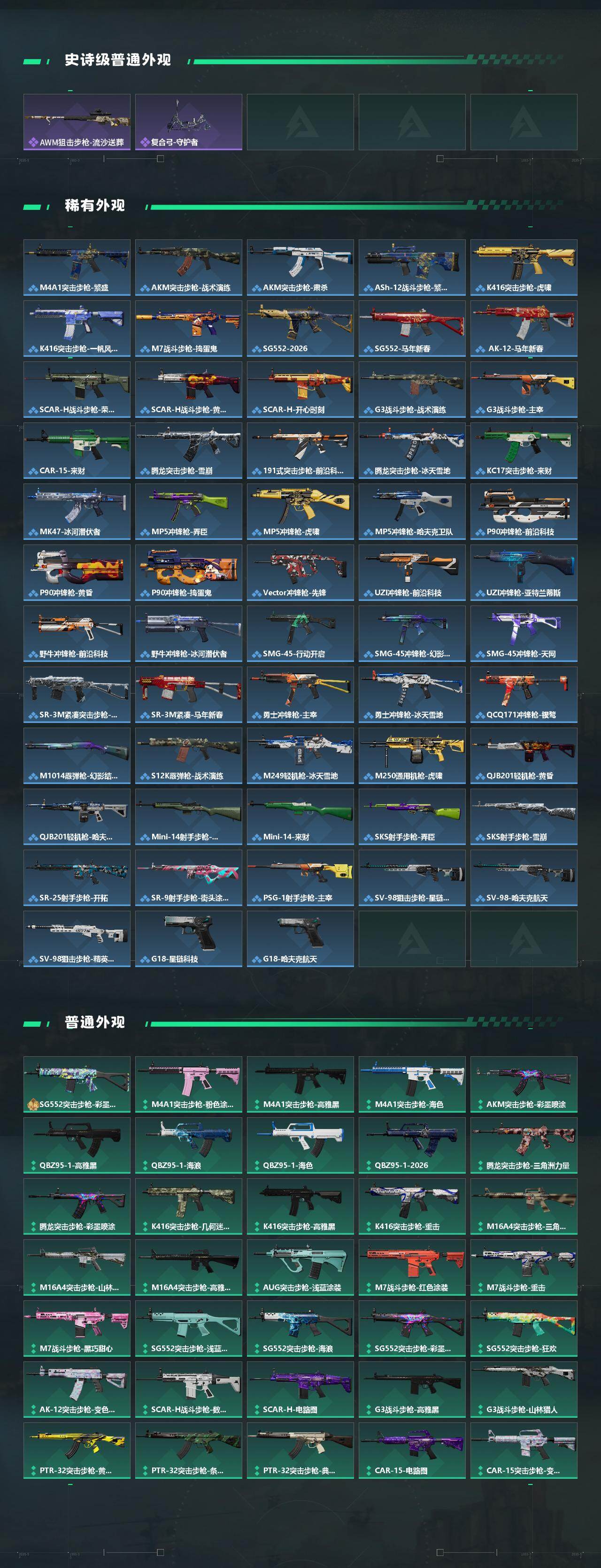 【传说外观】:M4A1突击步枪-蚀金玫瑰,M4A1突击步枪-阿米娅,AKM突击步枪-锦绣,QBZ95-1突击步枪-凌霄戍卫,ASh-12战斗步枪-鹅鸭杀,M16A4突击步枪-狩猎时