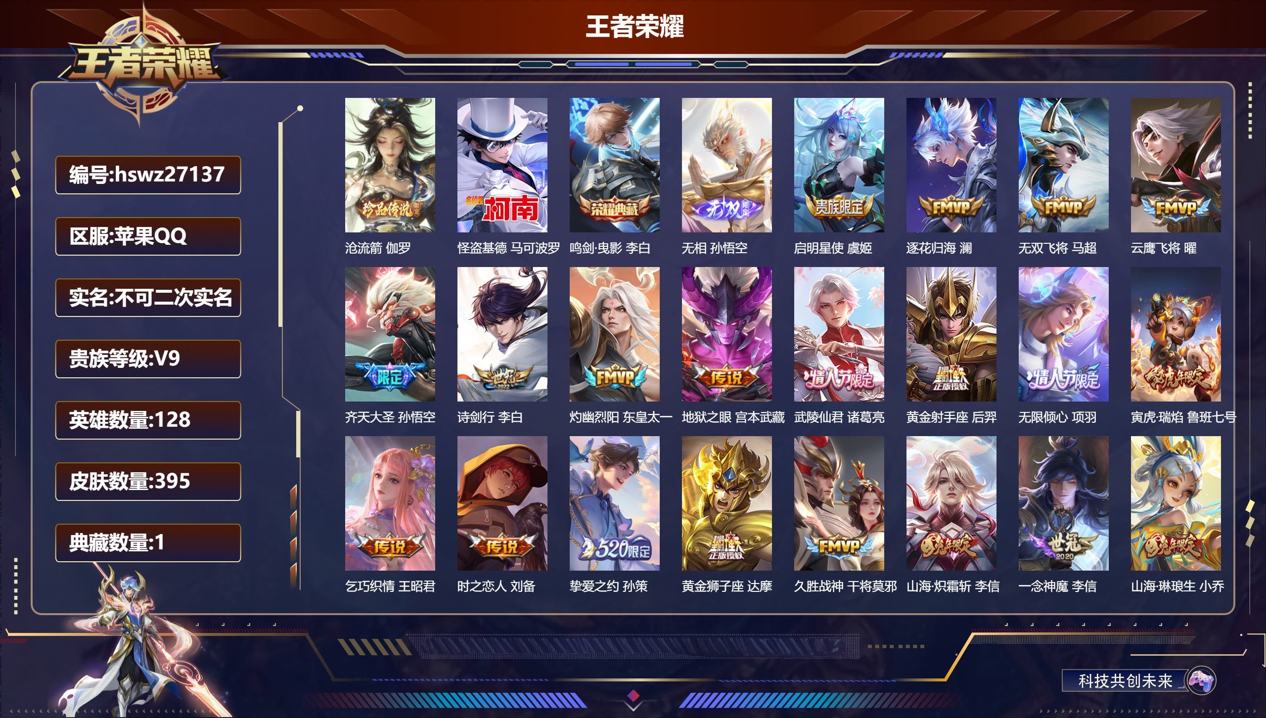苹果QQ/最强王者/395皮肤/128英雄/1典藏/0珍品无双/1无双/2珍品传说/28传说/121