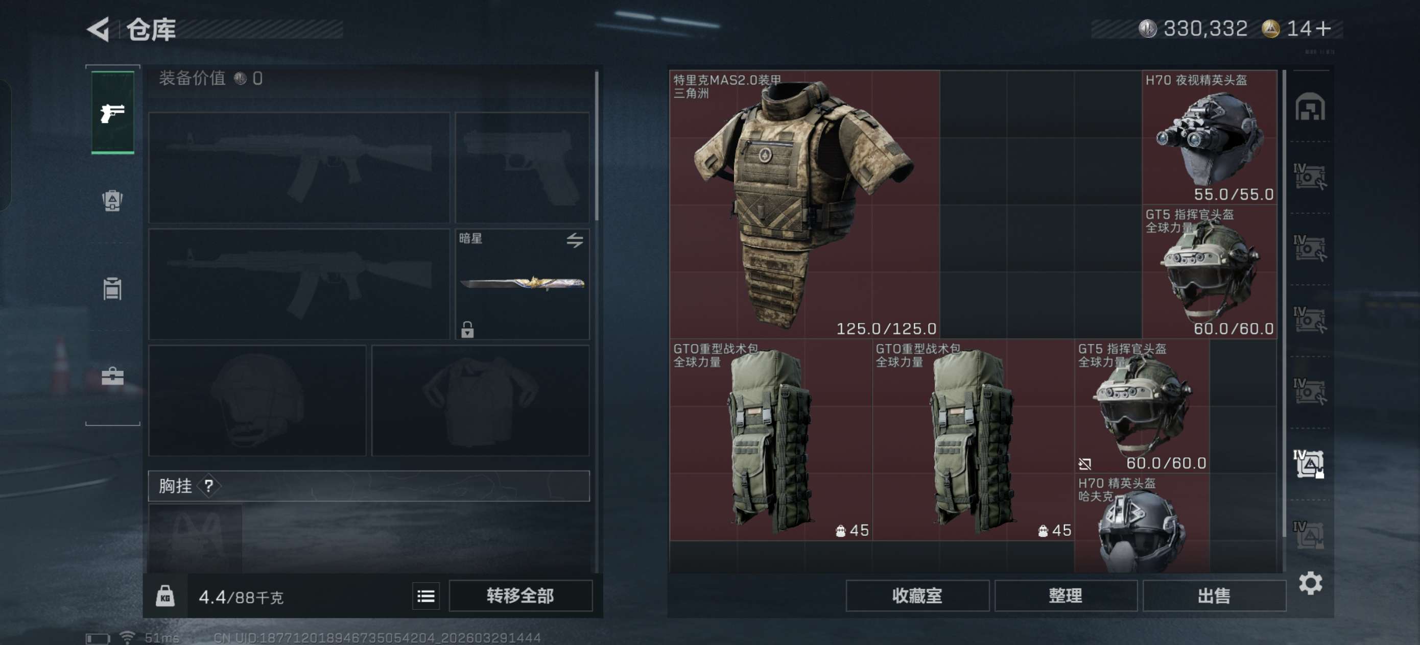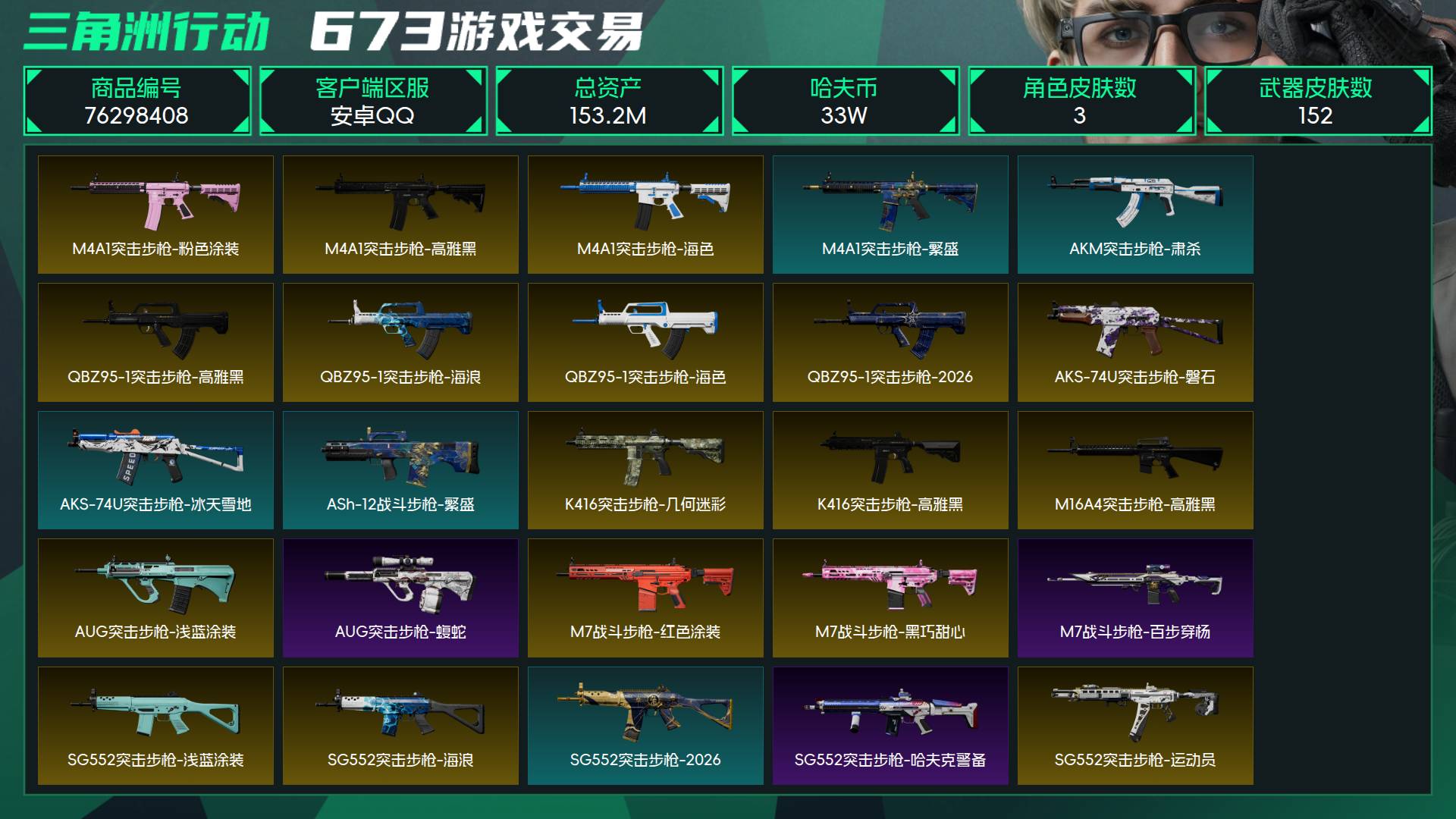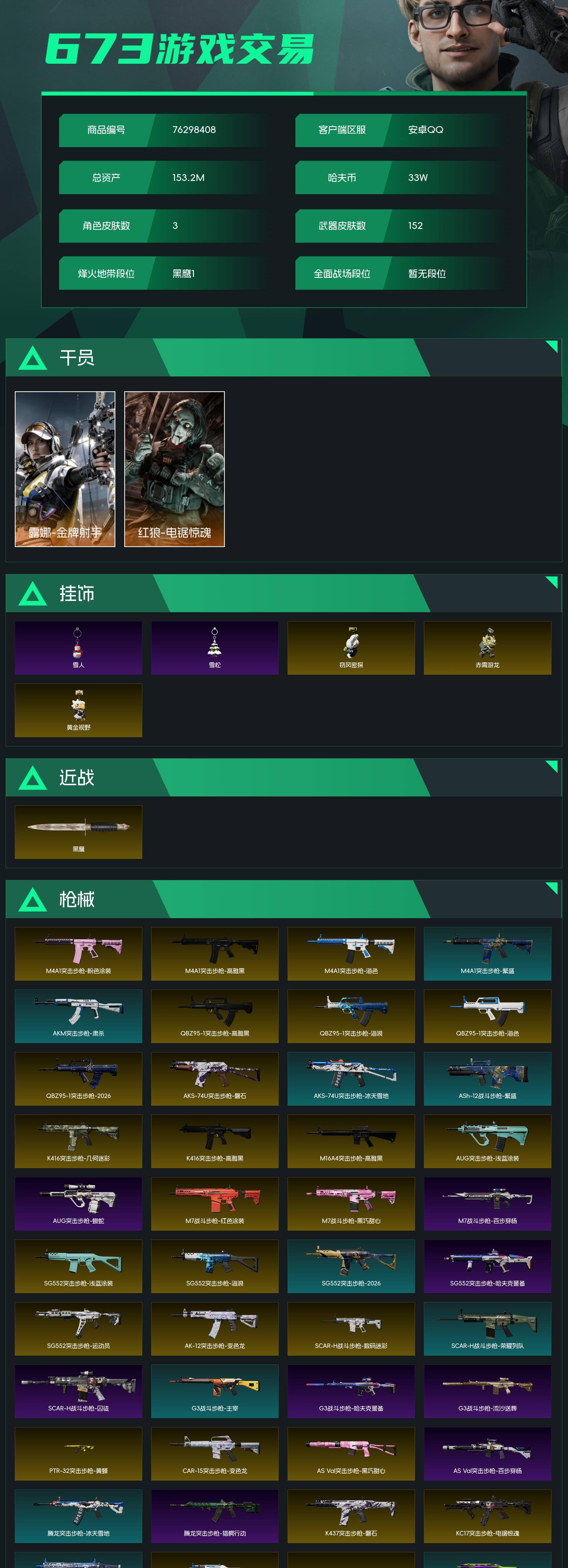 烽火段位黑鹰1 战场段位暂无段位 总资产153.2M 哈夫币33W 干员3 挂饰18 近战2 枪械152 载具26