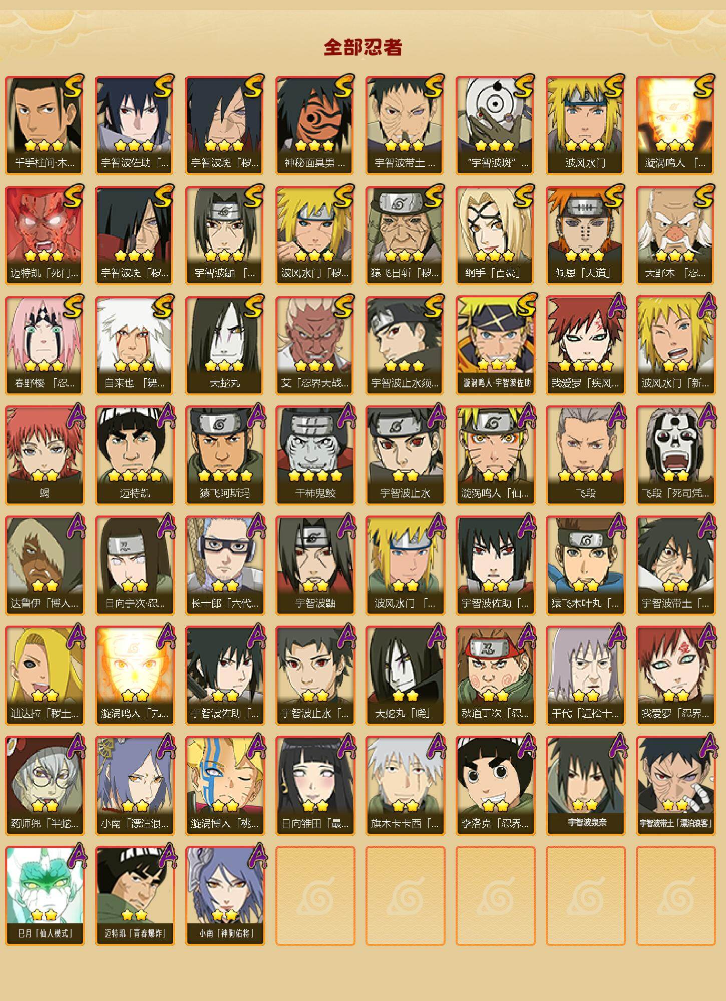 22S级忍者数-37A级忍者数【S级忍者】:猿飞日斩「秽土转生」(3星),波风水门「秽土转生」(3星),宇智波斑「秽土转生」(3星),宇智波斑「秽土转生·解」(3星),大野木「忍界大战」(3星),春野樱「忍界大战」(3星),宇智波带土「忍界大战」(3星),艾「忍界大战」(3星),宇智波鼬「须佐能乎」(3星),宇智波止水「须佐能乎」(3星),千手柱间「木叶创立」(3星),自来也「舞之豪杰」(3星),大蛇丸(3星),纲手「百豪」(3星),波风水门(3星),神秘面具男「红夜之刃」(3星),漩涡鸣人「九