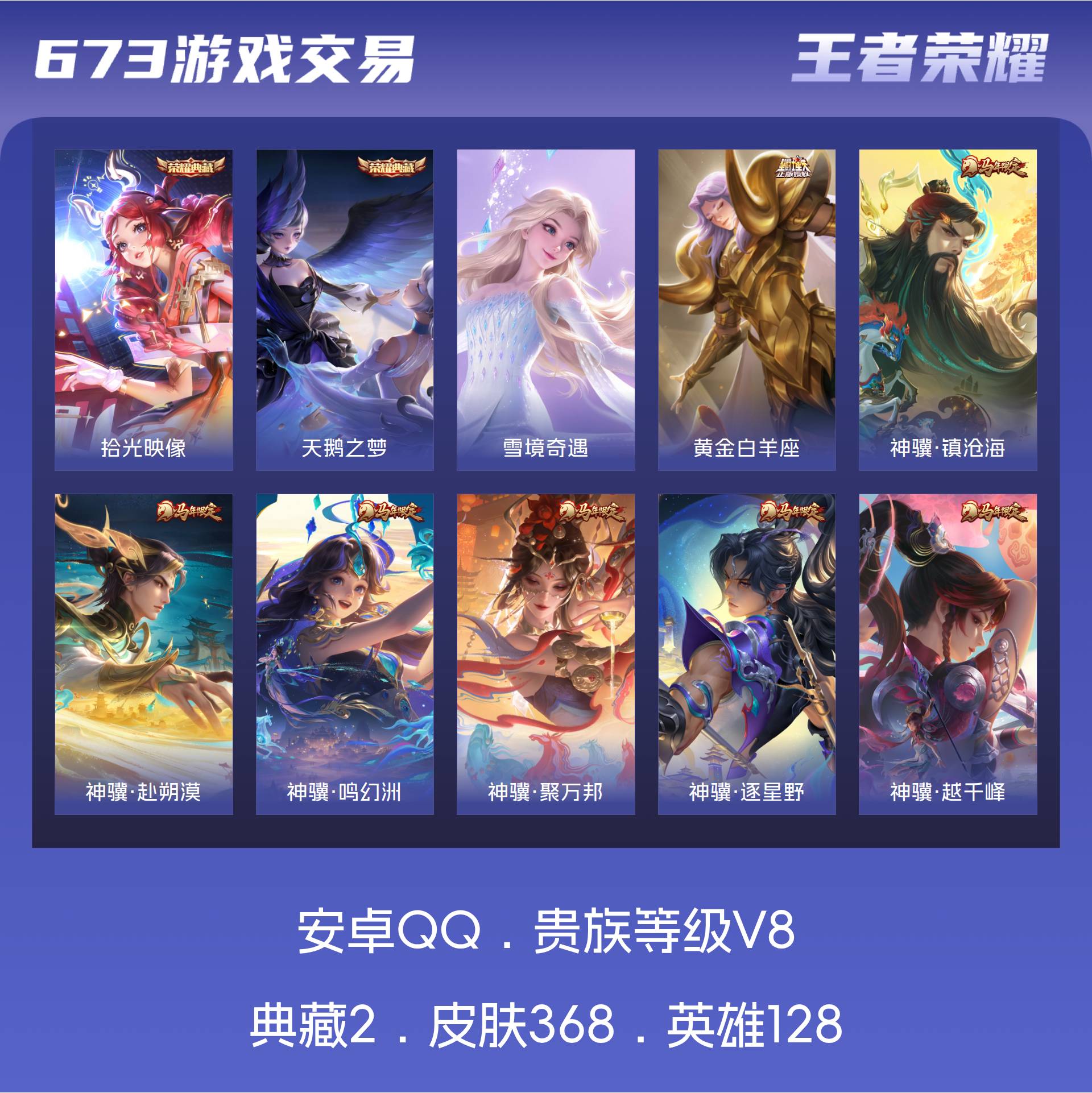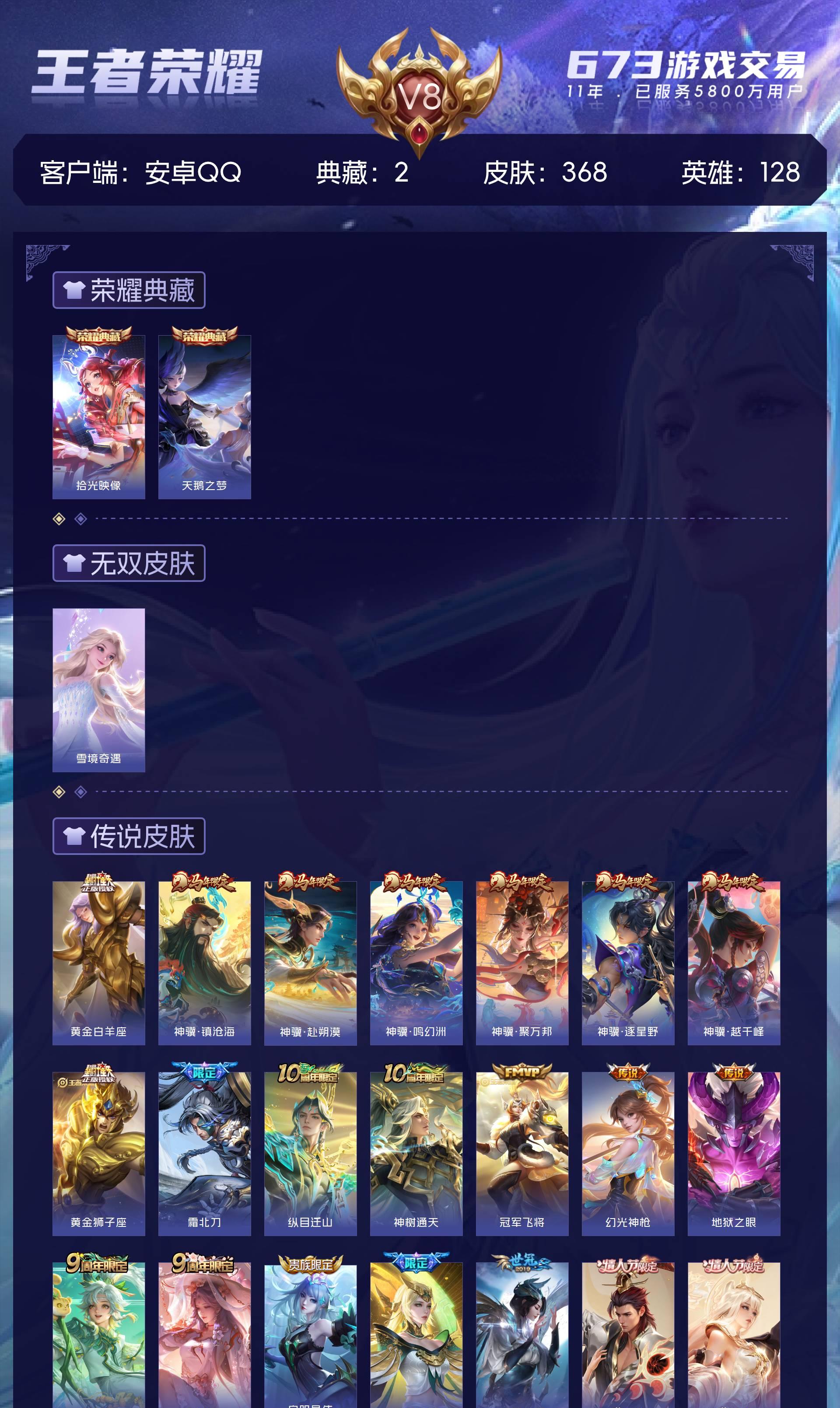 V8 皮肤368 英雄128 至尊星耀 荣耀典藏2 无双皮肤1 星传说3 传说26