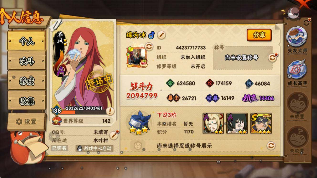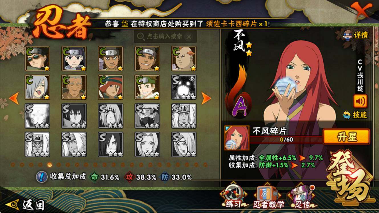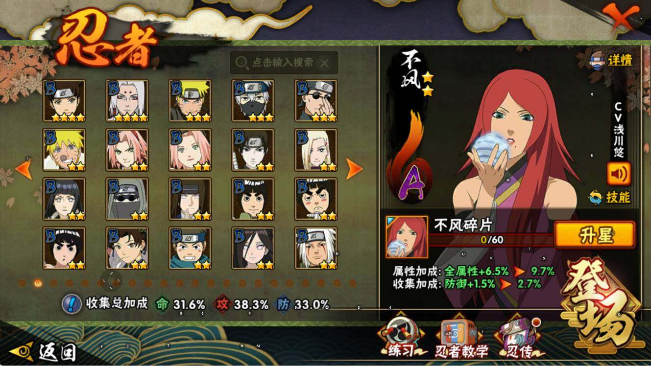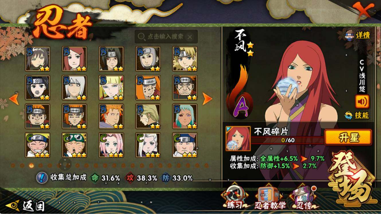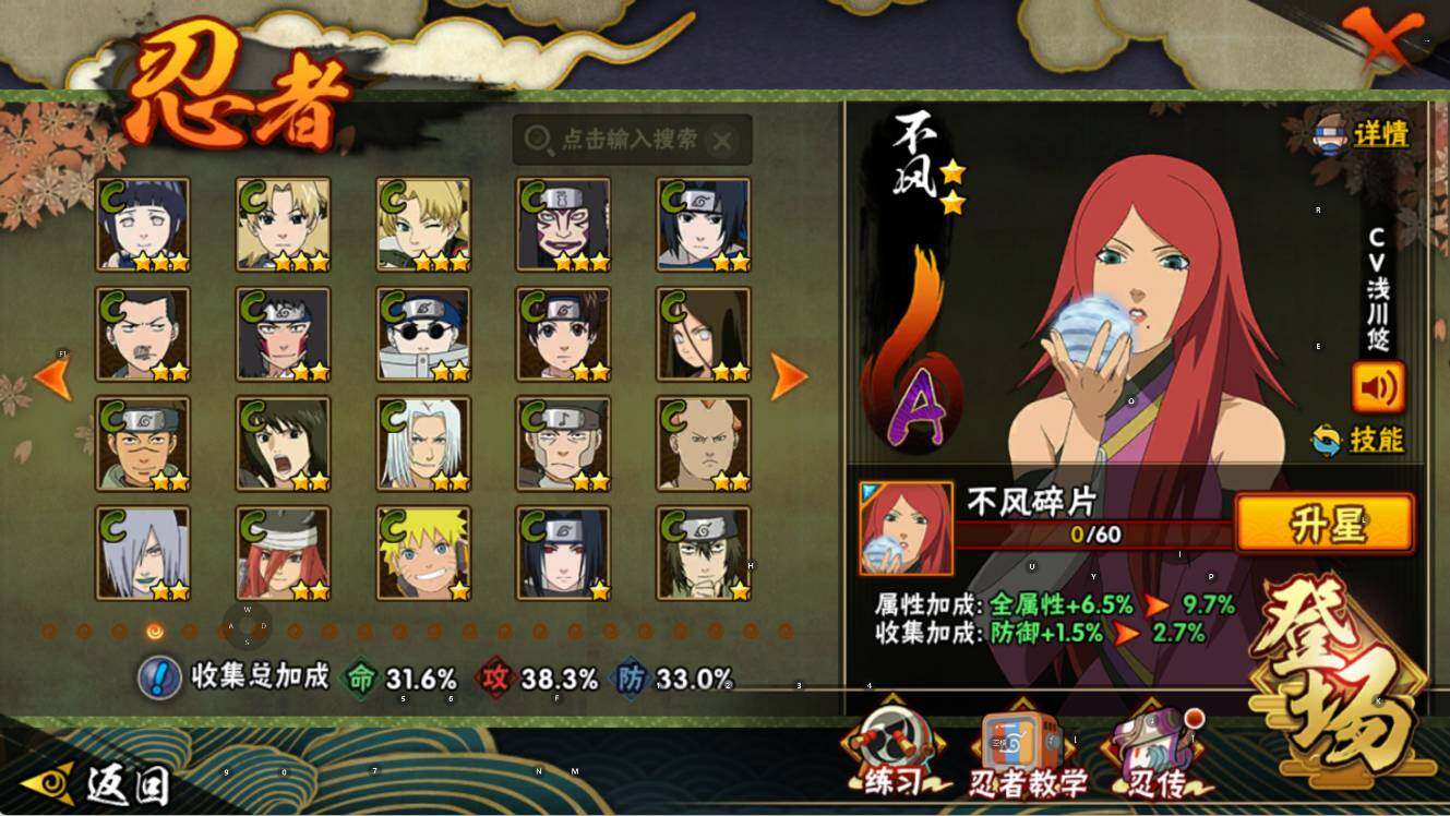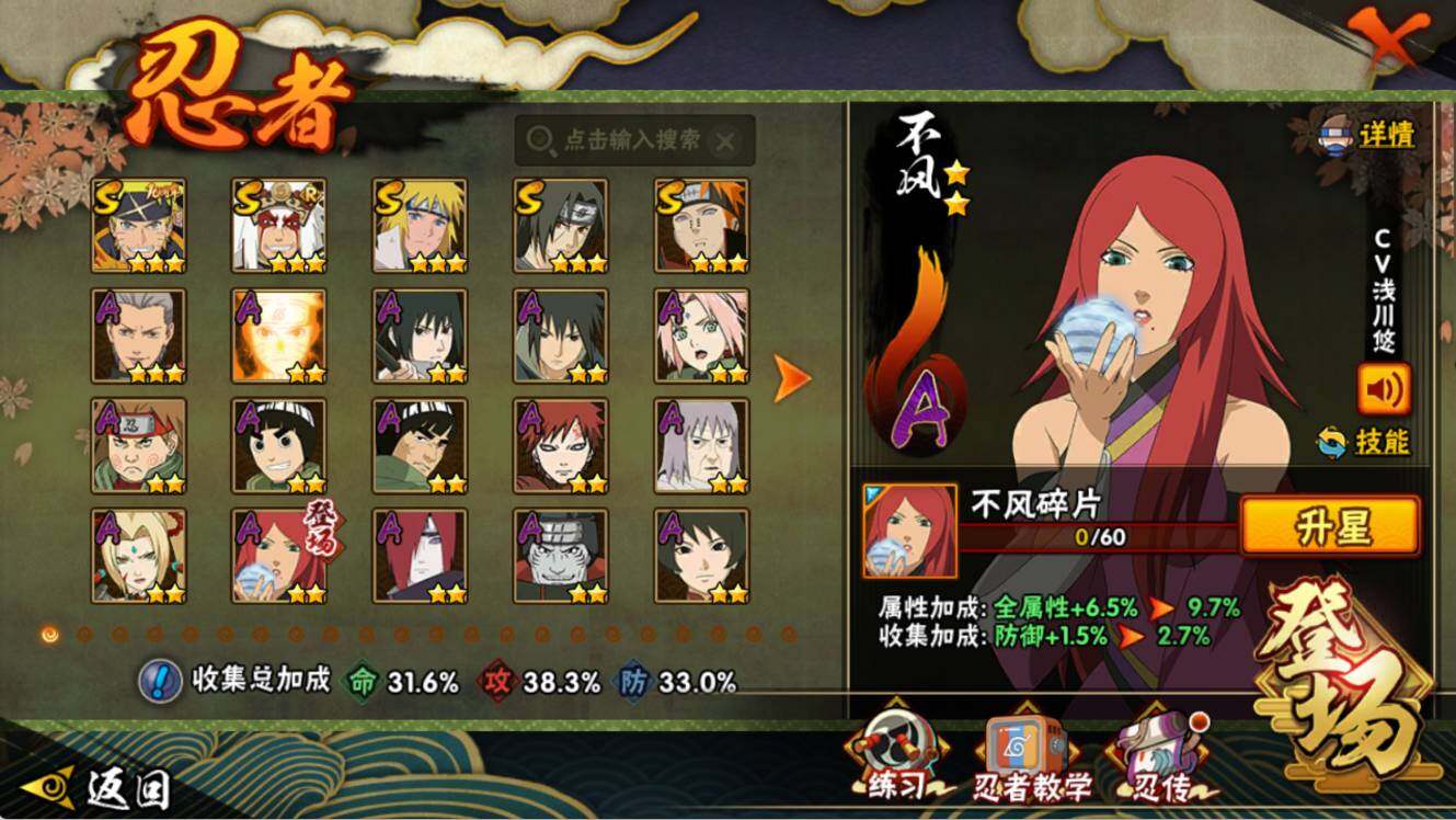 【S级忍者】:宇智波鼬「须佐能乎」(3星),自来也「舞之豪杰」(3星),波风水门(3星),佩恩「天道」(3星),漩涡鸣人·宇智波佐助(3星)