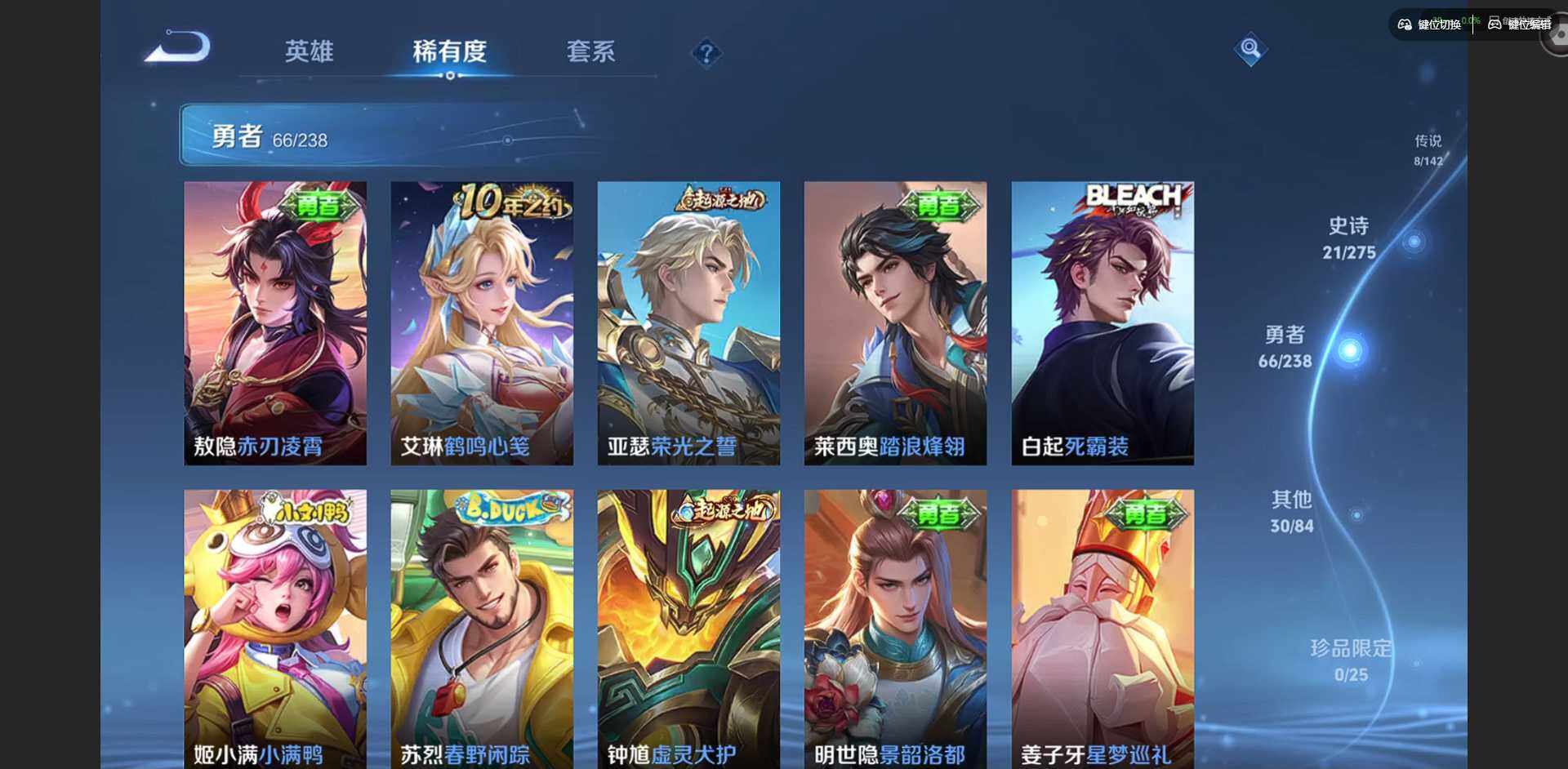 贵族等级: V6 英雄数: 127 皮肤数: 125 星传说: 幽冥火 传说皮