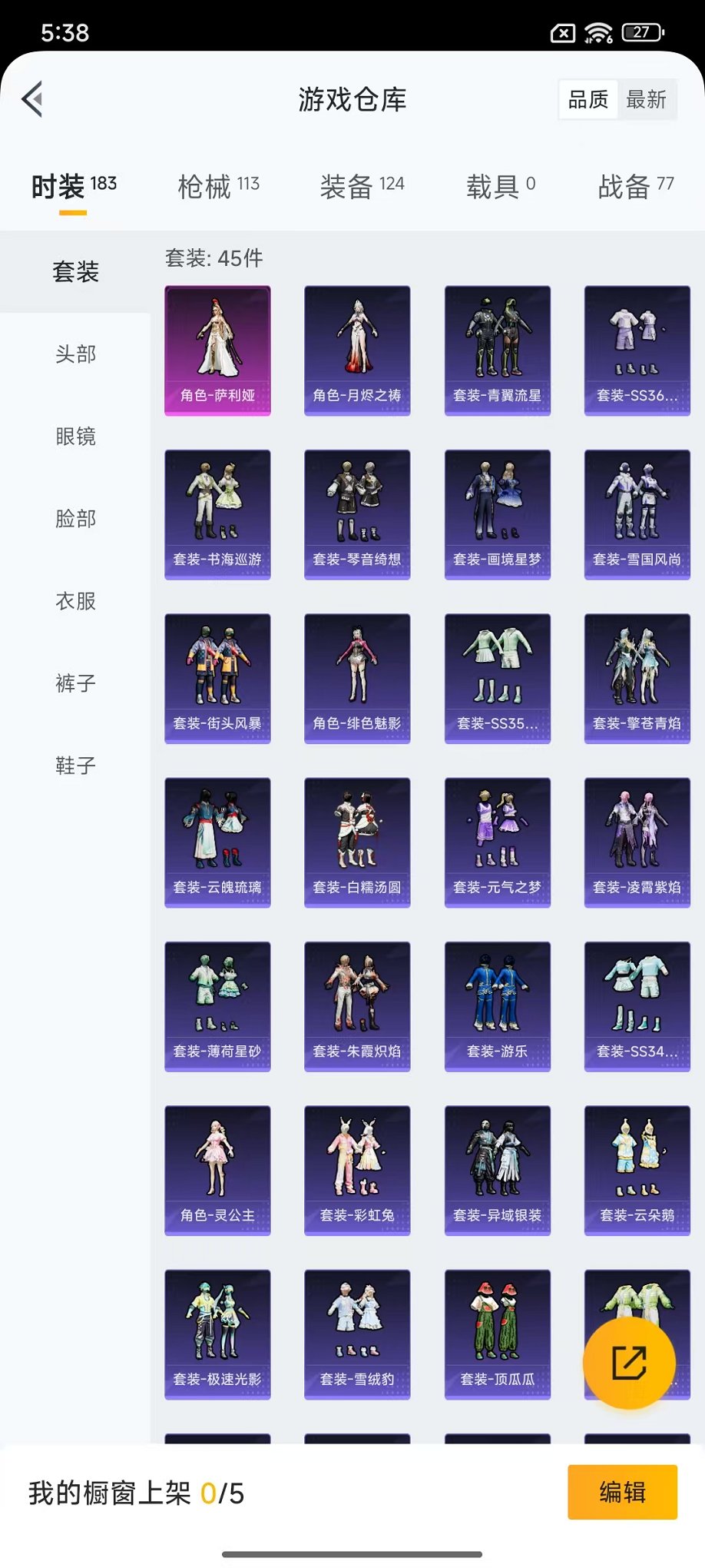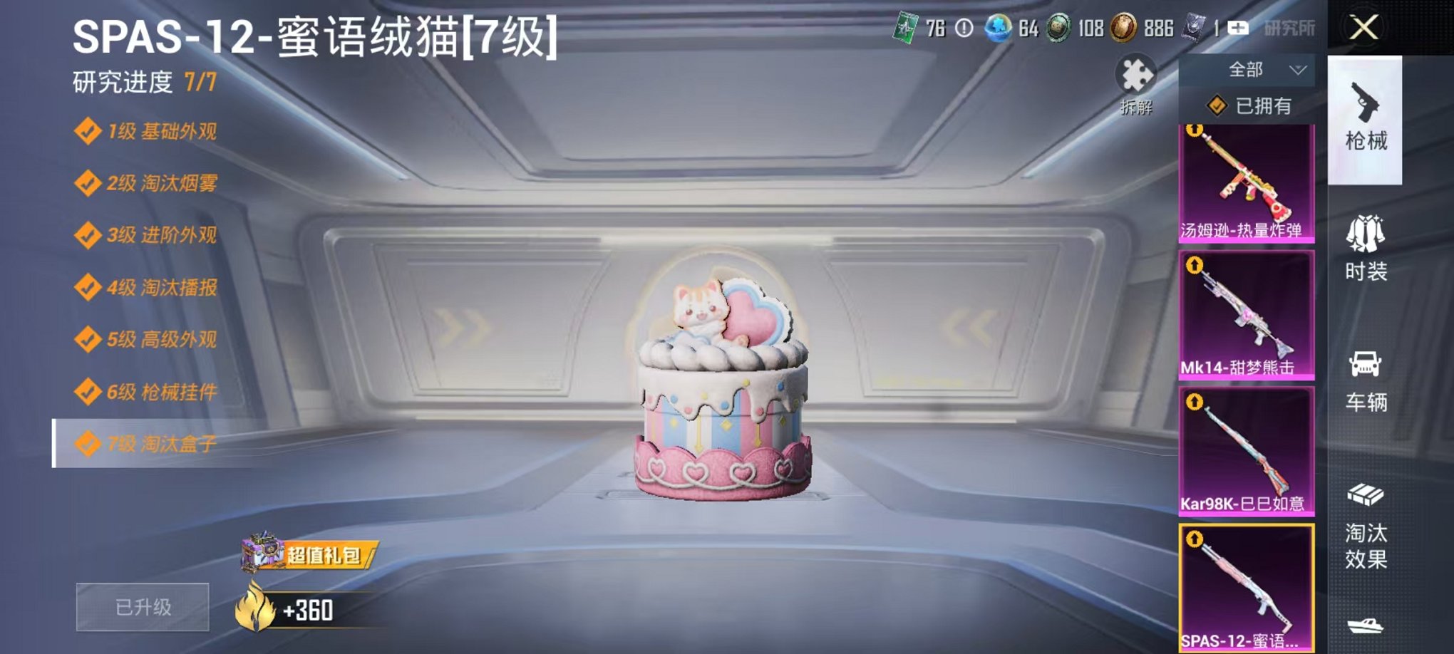 698-【1粉装7特效枪】 安卓V区-30161热力值--45套装-113枪皮 【1粉装】 角色-萨利娅【6特效枪】 Mk14-甜梦熊击(5级) SPAS-12-蜜语绒猫(7级) 汤姆逊-热量炸弹(5级) Kar98K-巳巳如意(5级) DP-28-豹影疾电(5级) MG-36-沧焰双生(5级)【7热门】 M416-蓝色火焰 SCAR-L-玉兔迎春 M762-天降萌叽 M762-彩虹符号 UMP45-蓝色火焰 MG3-幻世战舞者【1飞行器】 粉色滑翔尾迹 营地ID:956481531
