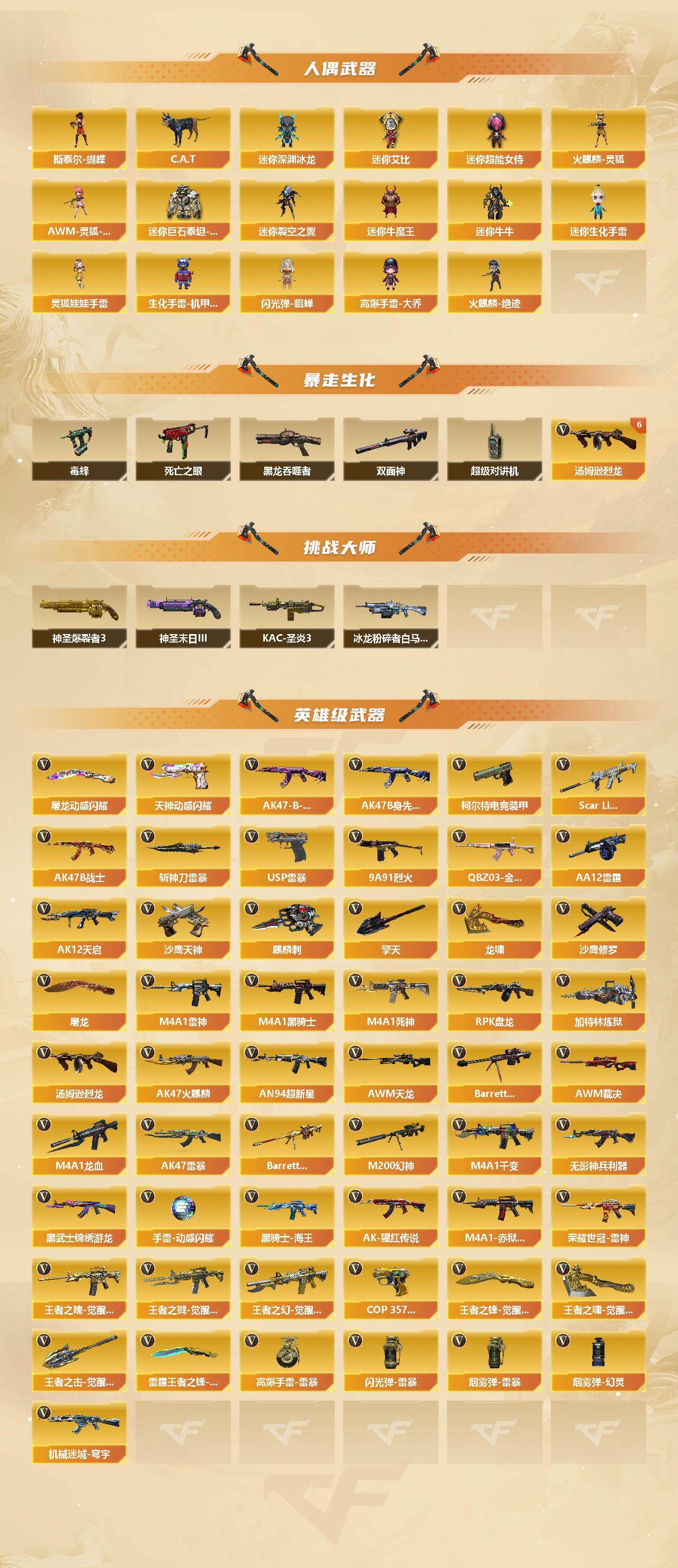 【热门武器】:传说暗裔,传说夜影,QBZ03-金色蔷薇,Scar Light-白虎,M200-幻神,死亡之眼,荣耀世冠-雷神,金色小号,C.A.T,毒蜂,M4A1-黑骑士,汤姆逊-烈龙*7,RPK-盘龙*4,加特林-炼狱*3,斯泰尔-蝴蝶,火麒麟-绝迹,USP-雷暴*2,沙鹰-修罗*3