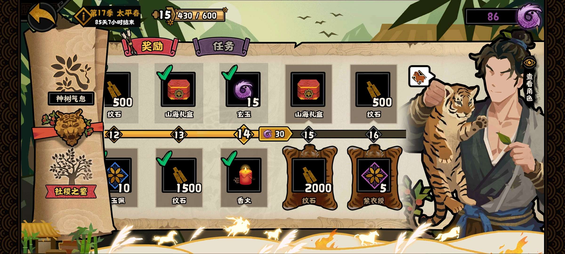 59天,37妙,4金武,4君主,38华服,还有一个月盘子,社稷之鉴已开,氪了4000多,可小刀。