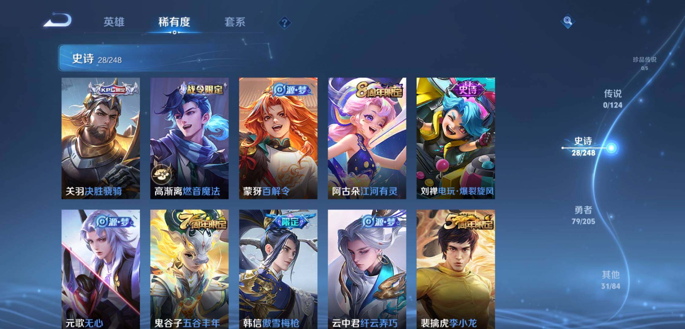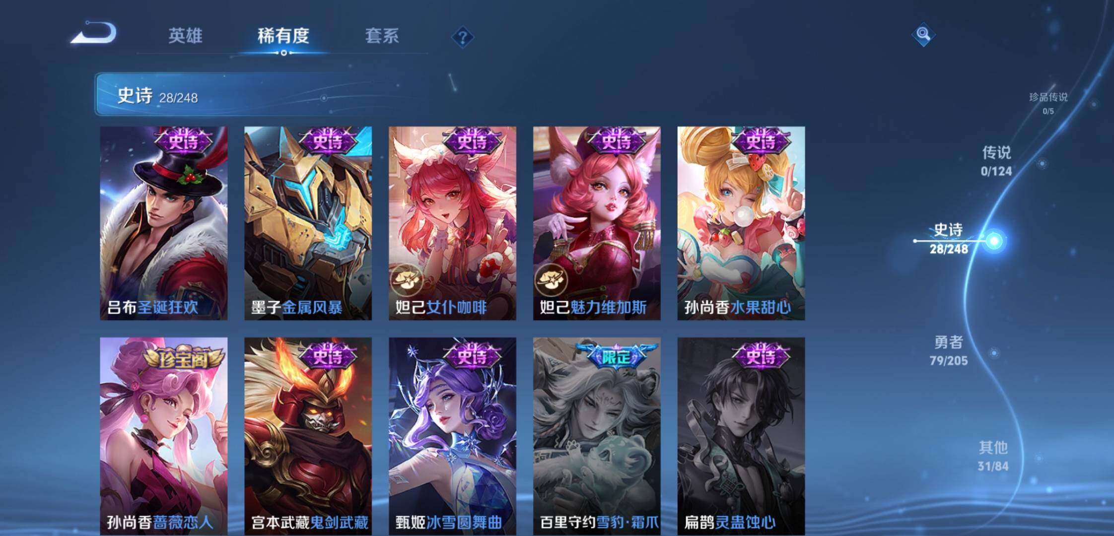 【限定皮肤】:姜子牙天穹之誓,狄仁杰阴阳师,孙尚香蔷薇恋人,吕布猎兽之王,元歌无心,狄仁杰万华元夜,达摩沙漠行僧,项羽海滩派对,老夫子醍醐杖,程咬金演武夺筹,韩信傲雪梅枪,兰陵