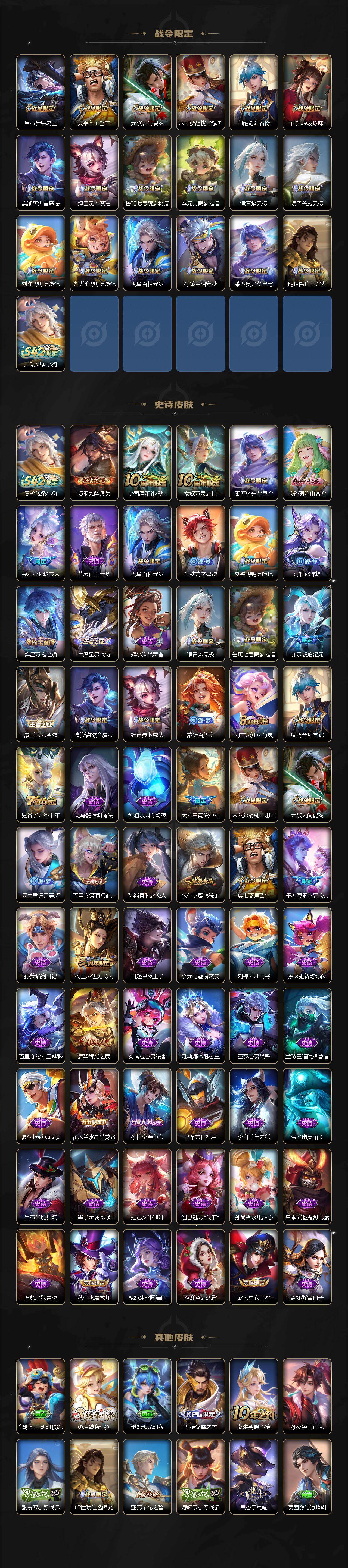 【传说皮肤】:后羿神树通天,云缨幻光神枪,裴擒虎祥瑞亨通,桑启鸣野蒿,孙策乘龙淬吴钩,澜逐花归海,铠绛天战甲,镜炽阳神光,
