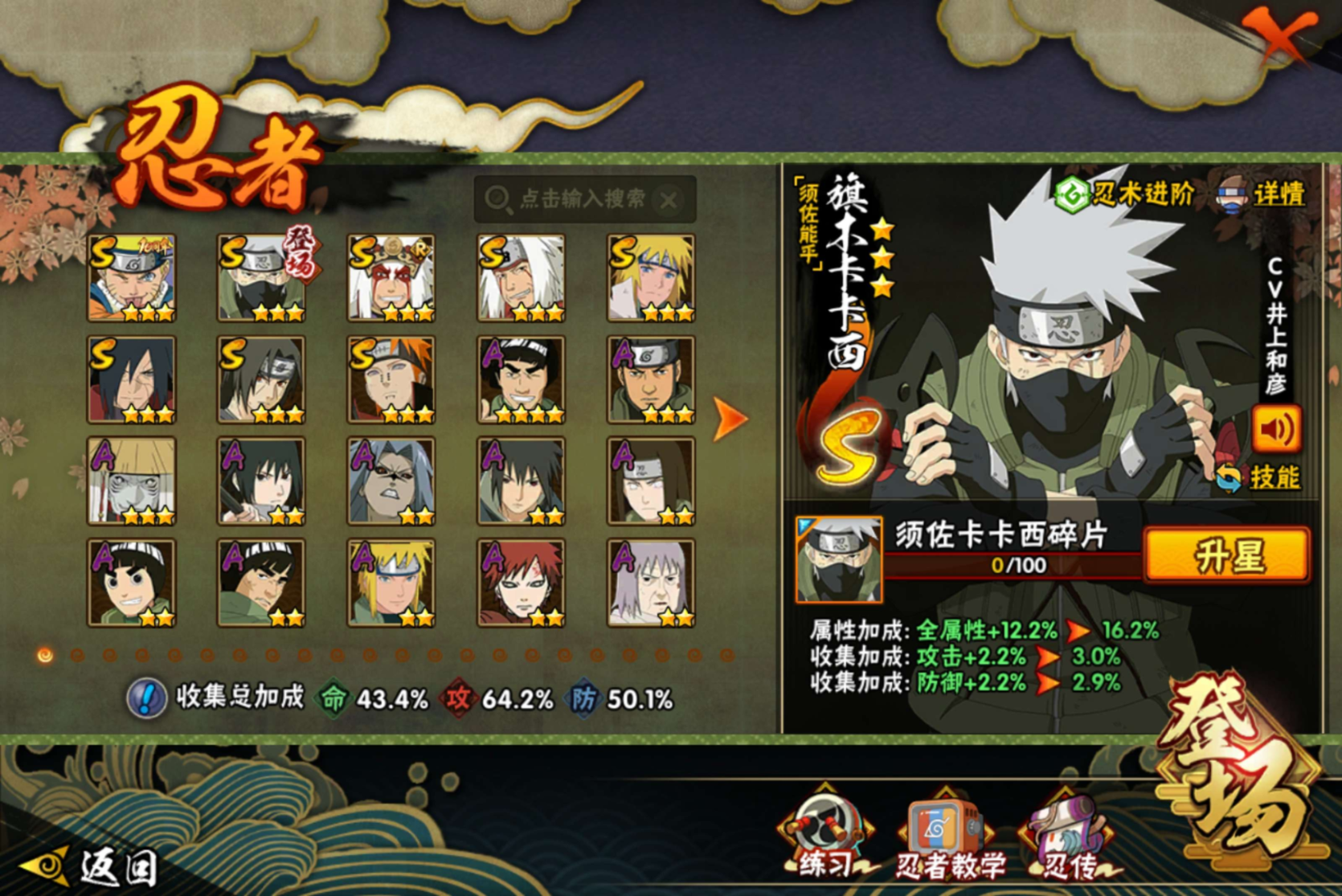 【S级忍者】旗木卡卡西「须佐能乎」(3星),自来也「传说中的三忍」(3星),宇智波斑「秽土转生·解」(3星),自来也「舞之豪杰」(3星),宇智波鼬「须佐能乎」(3星),漩涡鸣人·宇智波佐助(3星),佩恩「天道」(3星),波风水门(3星),