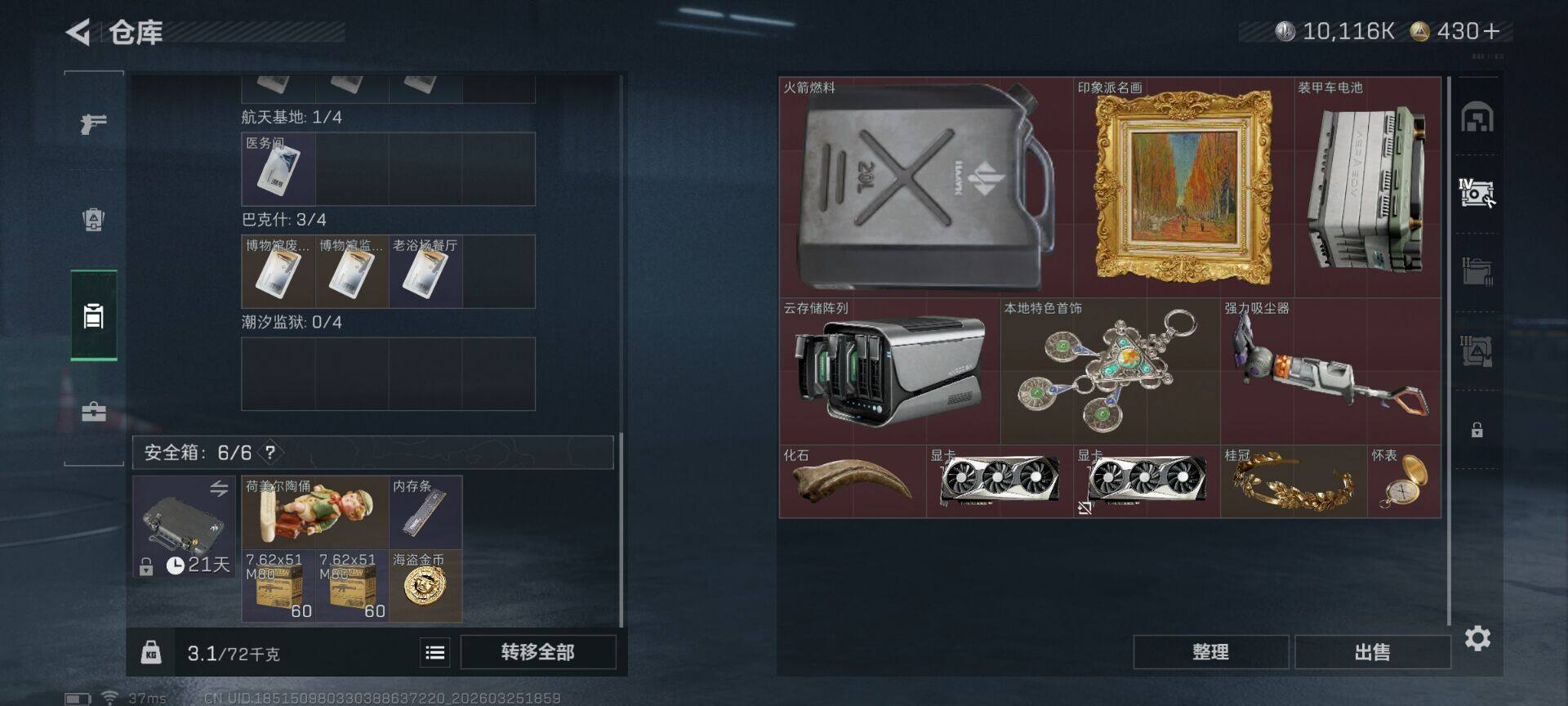 总资产(M):60M/哈夫币(K):10116K/传说枪皮数:8/全面战场等级:1_段位:无段位/烽火地带等级:37_段位:青铜/