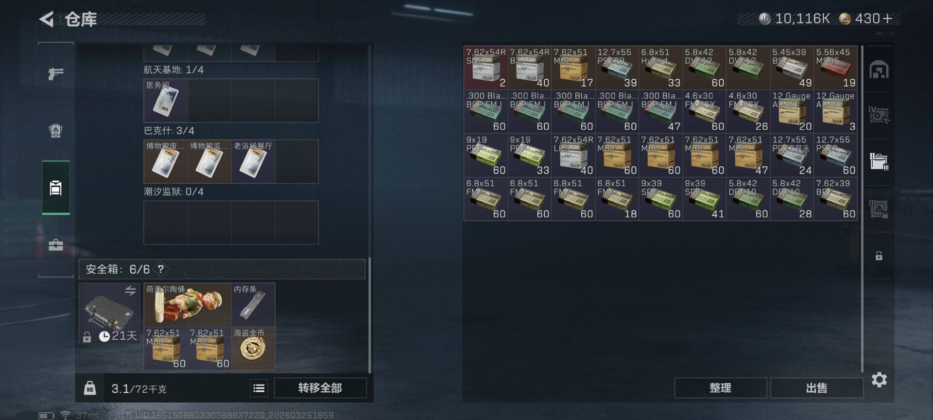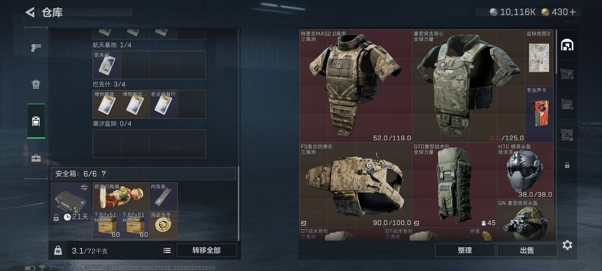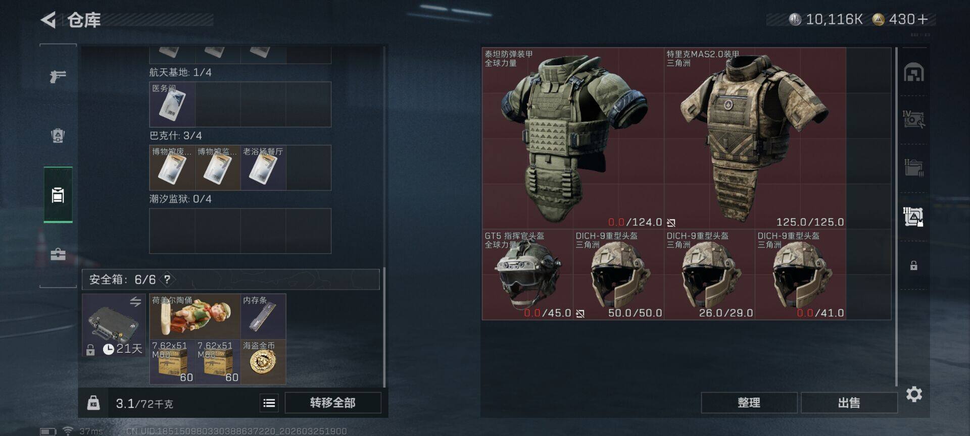 【SJZX1844】总资产(M):60M/哈夫币(K):10116K/哈夫币(K):10116K/传说枪皮数:8/全面战场等级:1_段位:无段位/烽火地带等级:37_段位:青铜/近战-暗星/近战-黑鹰/K416突击步枪-行动记录/K437突击步枪-锦绣/MK47突击步枪-暗星/SR-3M紧凑突击步枪-暗星/M14射手步枪-蛮荒/M14射手步枪-缄花/SR-25射手步枪-缄花/.357左轮-缄花/Vector冲锋枪-阿萨拉文明/MP7冲锋枪-六套之力/M249轻机枪-丛影谍踪/VSS射手步枪-丛影