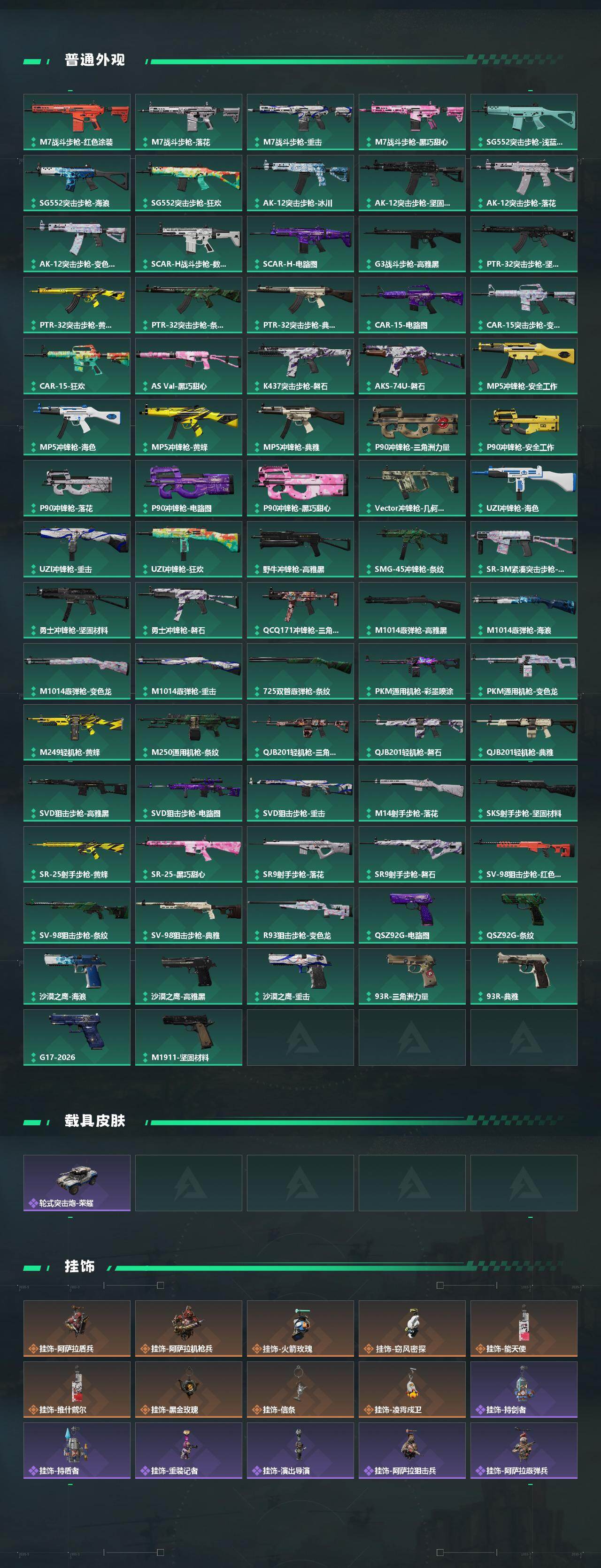 【传说外观】:M4A1突击步枪-蚀金玫瑰,AUG突击步枪-悠然茶歇,SG552突击步枪-运动员,AK-12突击步枪-夜鹰,SCAR-H战斗步枪-启航,腾龙突击步枪-捞点薯条,KC17突击步枪-电锯惊魂,MK47突击步枪-