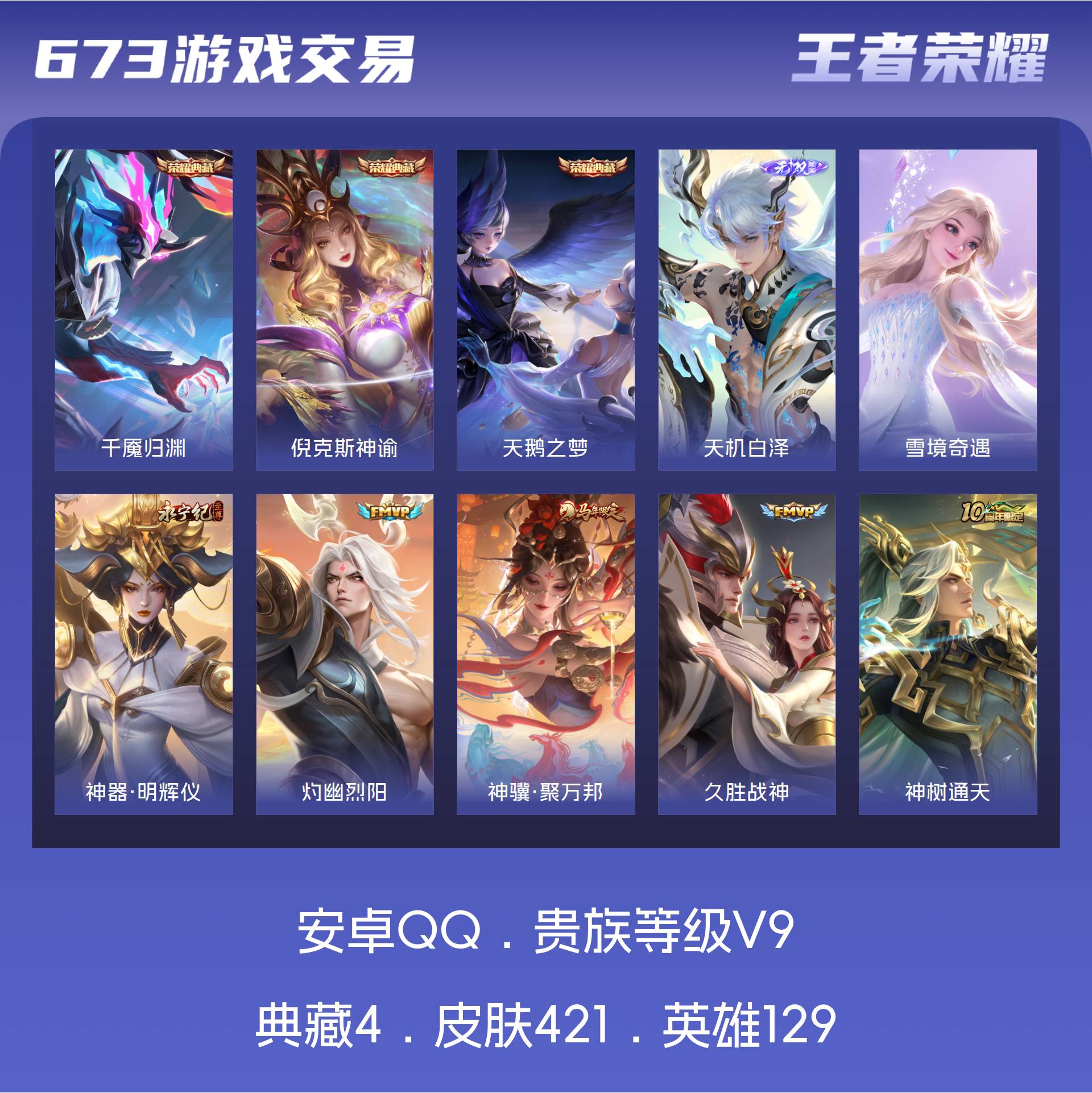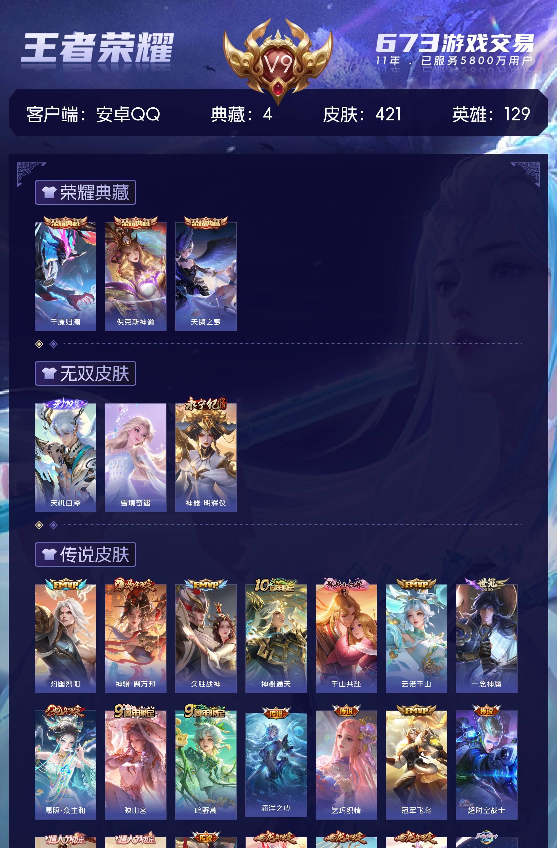 安卓QQ/荣耀王者/421皮肤/129英雄/3典藏/0珍品无双/3无双/0珍品传说/39传说/137