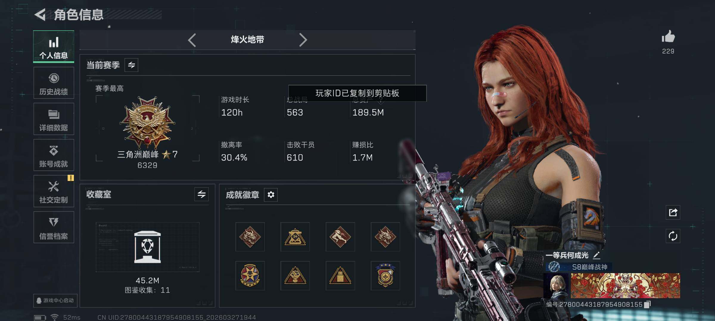 189m总资产-24095k哈夫币-60烽火等级-黑鹰-45战场等级-列兵