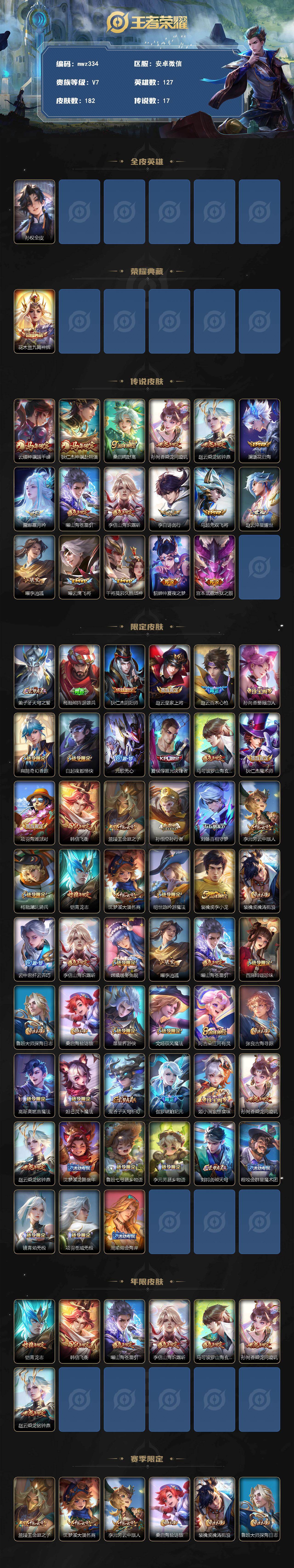 【mwz334】安卓WX-V7-最强王者段位-127英雄-182皮肤-1典藏皮肤-17传说-61史诗