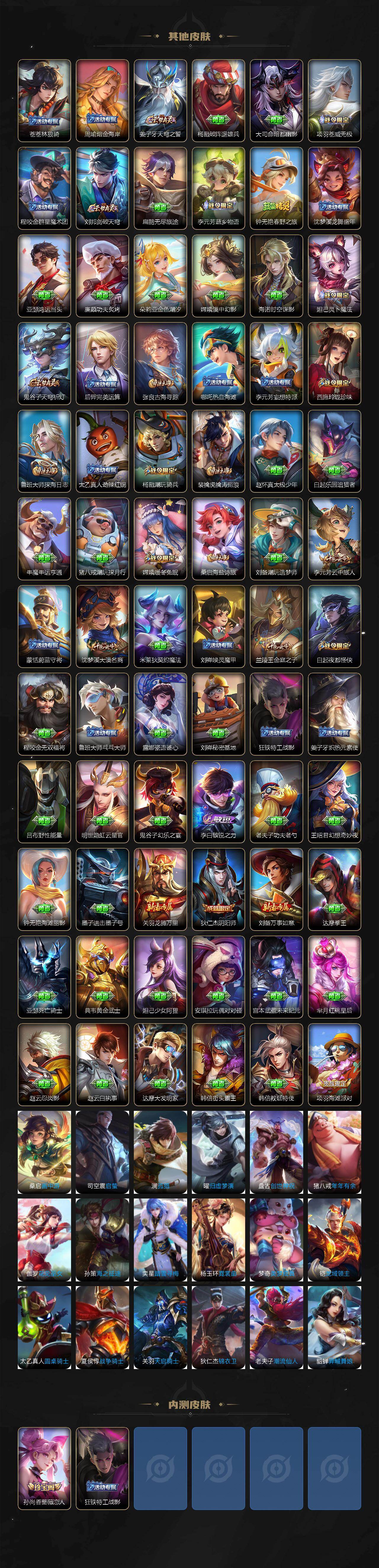 【传说皮肤】:云缨神骥越千峰,狄仁杰神骥赴朔漠,桑启鸣野蒿,孙尚香乘龙问璇玑,赵云乘龙铭钟鼎,澜逐花归海,露娜霜月吟,曜山海苍雷引,李信山海炽霜斩,李白诗剑行,马超无双飞将,赵云淬星耀世,曜李逍遥 ,曜云鹰飞将