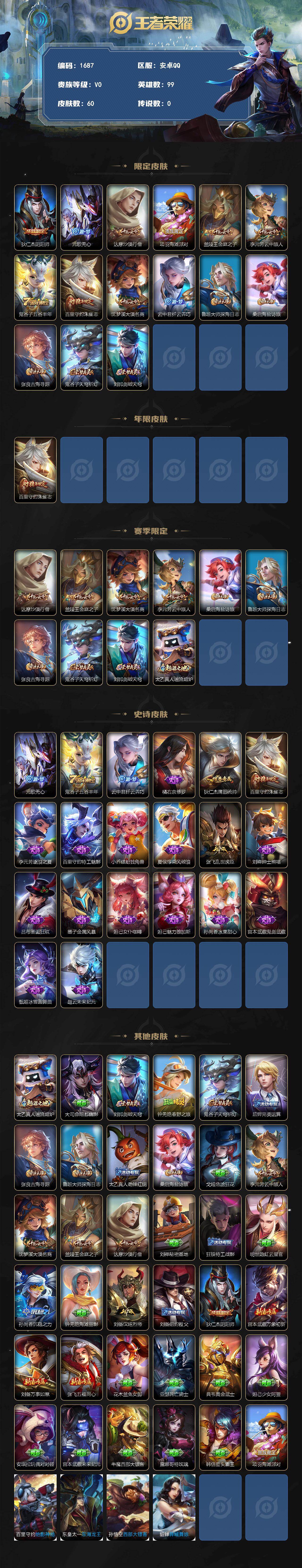709958 王者荣耀账号 安卓Q-V0-荣耀黄金IV段位-99英雄-60皮肤-20史诗
