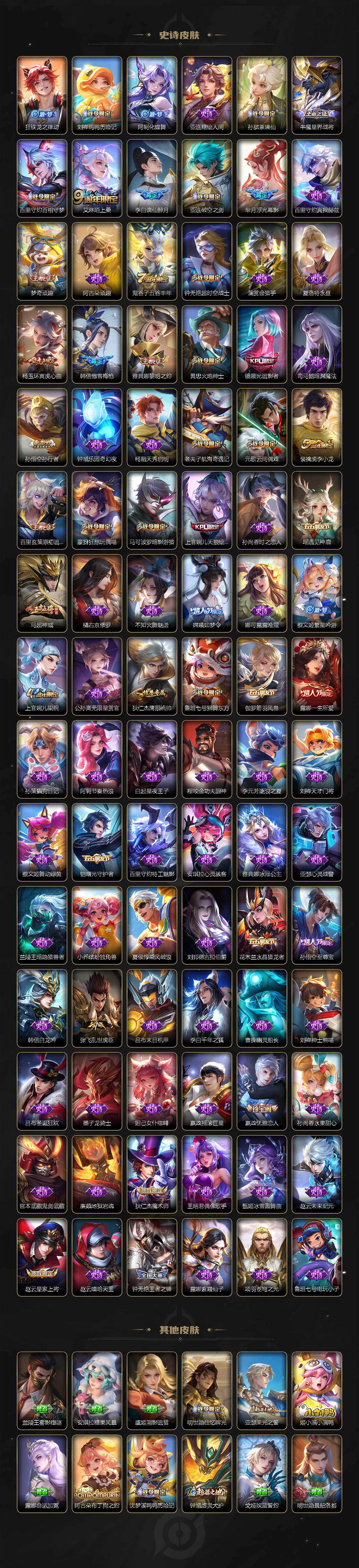 【传说皮肤】:朵莉亚神骥鸣幻洲,吕布怒海麟威,孙策末日机甲,裴擒虎寅虎赤拳,孙尚香异界灵契,公孙离祈雪灵祝,虞姬启明星使,曜云鹰飞将,李信一念神魔,刘备时之恋人,干将莫邪久胜战神,虞姬云