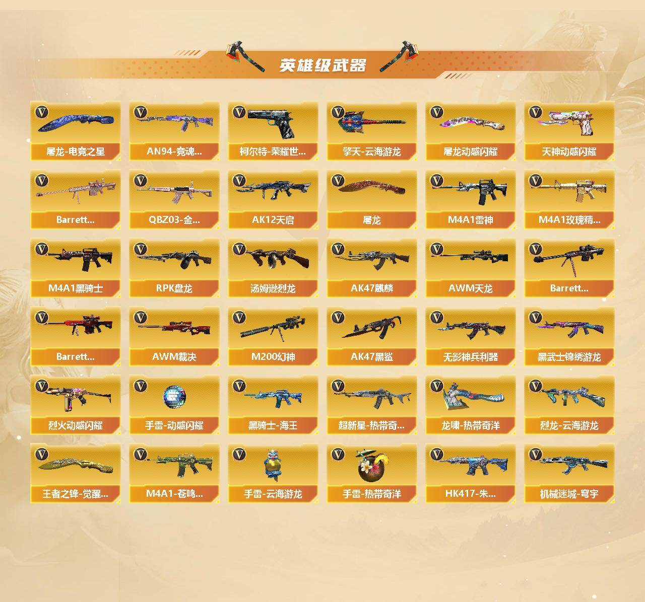 【热门武器】:QBZ03-金色蔷薇,M200-幻神,柯尔特-荣耀世冠白鲨2023,M4A1-黑骑士*2,汤姆逊-烈龙*3,RPK-盘龙,COP-白鲨,炽芒蝶刃-荣耀世冠白鲨2023 皮肤