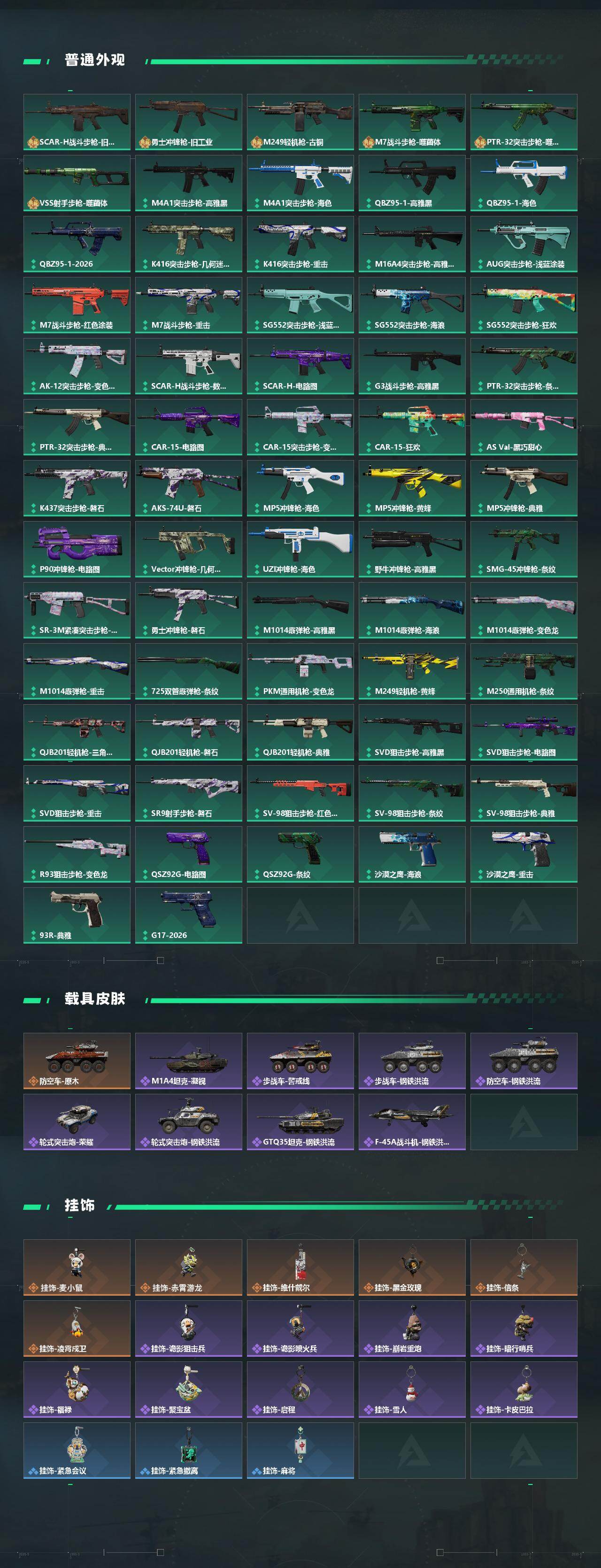 【传说外观】:M7战斗步枪-零度协议,SG552突击步枪-运动员,SCAR-H战斗步枪-启航,腾龙突击步枪-死神玫瑰,P90冲锋枪-信条,M250通用机枪-骑士之心,M14射手步枪-蛮荒,SR-25射手步枪