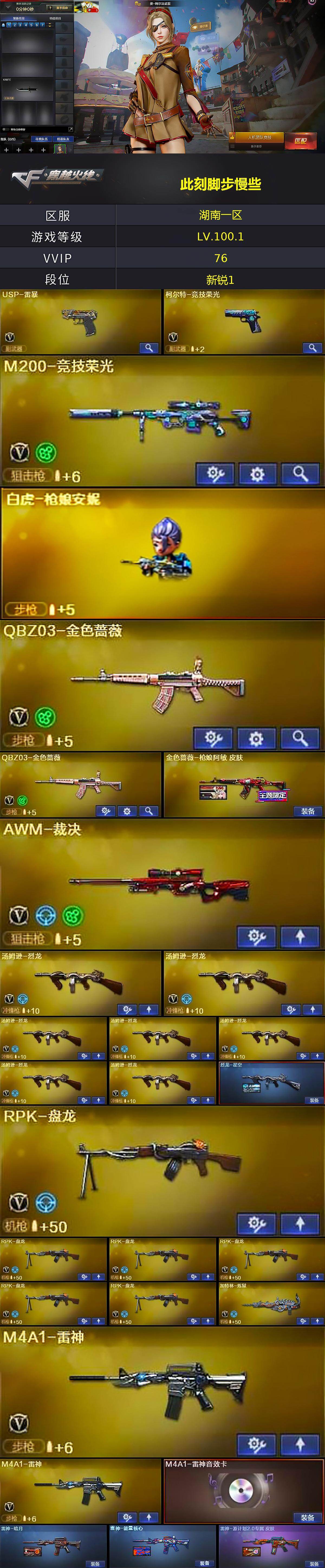 【ky6083】湖南一区-77V-4王者武器数-2炫金武器数【热门武器】:QBZ03-金色蔷薇*2,HK417-朱雀,M200-竞技荣光,死亡之眼,M4A1-黑骑士,汤姆逊-烈龙*7,RPK-盘龙*6,加特林-炼狱,降世魔童,白虎-枪娘安妮,USP-雷暴,沙鹰-修罗*2【王者炫金武器】:炫金无影,炫金毁灭【音效卡】:M4A1-雷神音效卡,M4A1-黑骑士音效卡,Barrett-毁灭音效卡【皮肤】:金色蔷薇-枪娘阿敏 皮肤,烈龙-星空,雷神-暗月,雷神-能量核心,雷神-源计划2.0专属 皮肤,火麒
