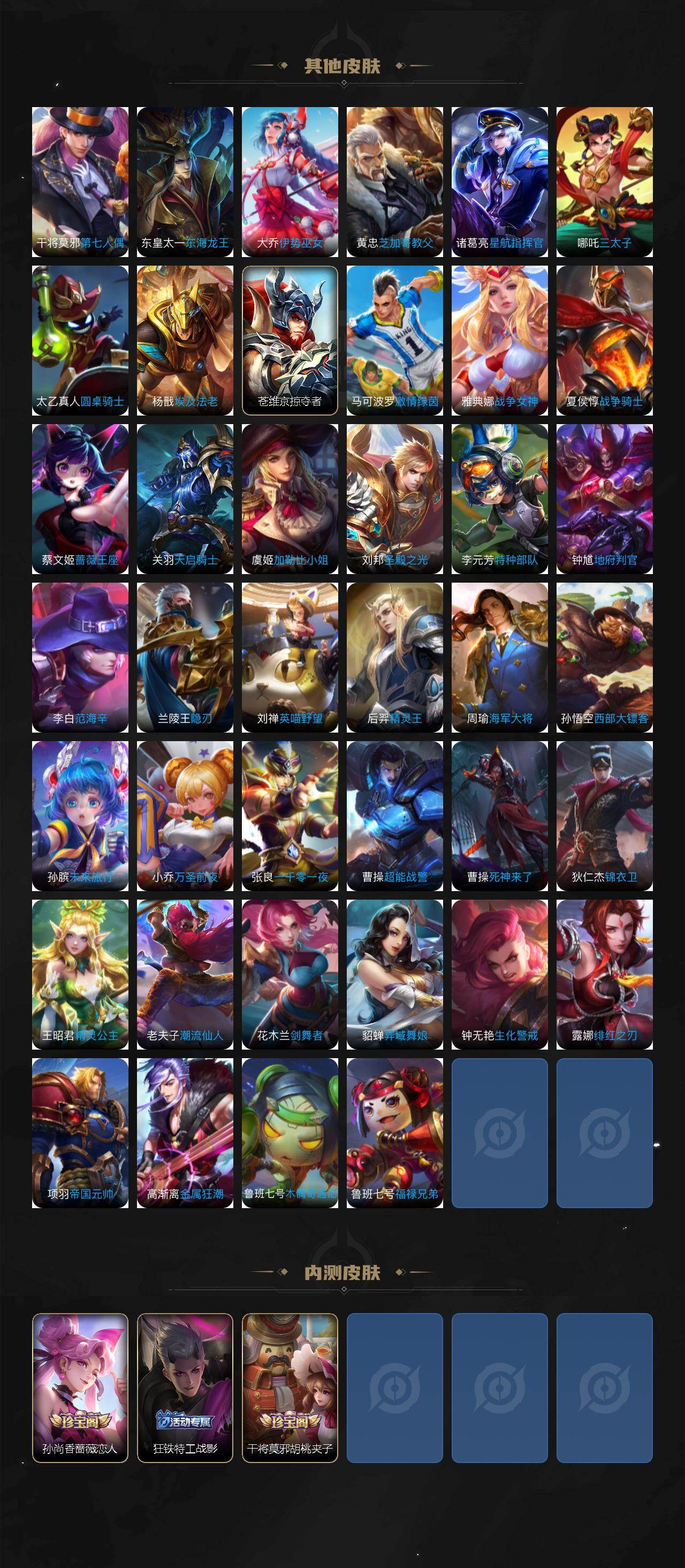 【英雄全皮】:刘禅全皮,刘邦全皮,孙权全皮,鬼谷子全皮,狂铁全皮,李信全皮,猪八戒全皮,敖隐全皮,蒙恬全皮,司空震全皮,戈娅全皮,空空儿全皮,海诺全皮,少司缘全皮