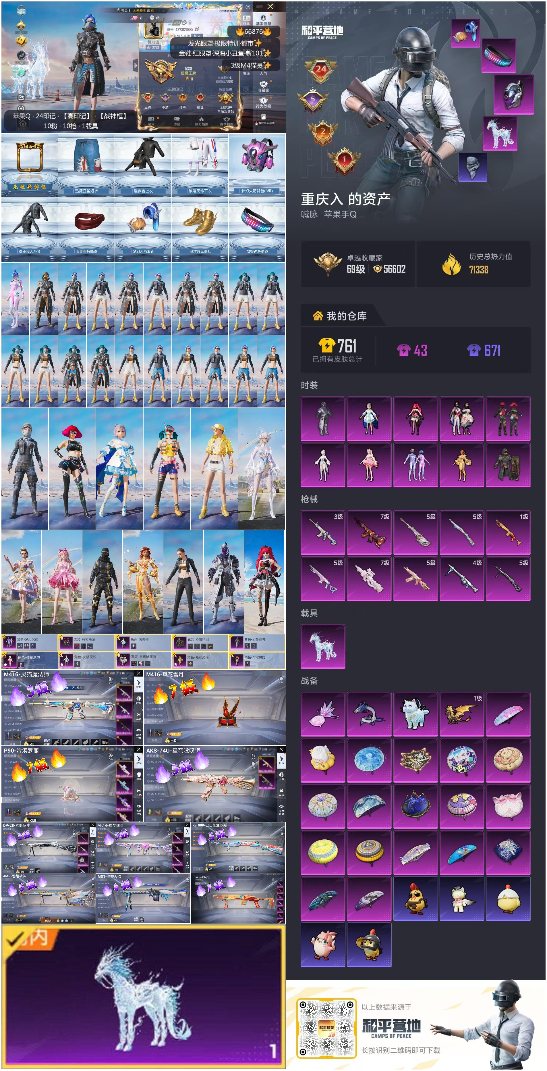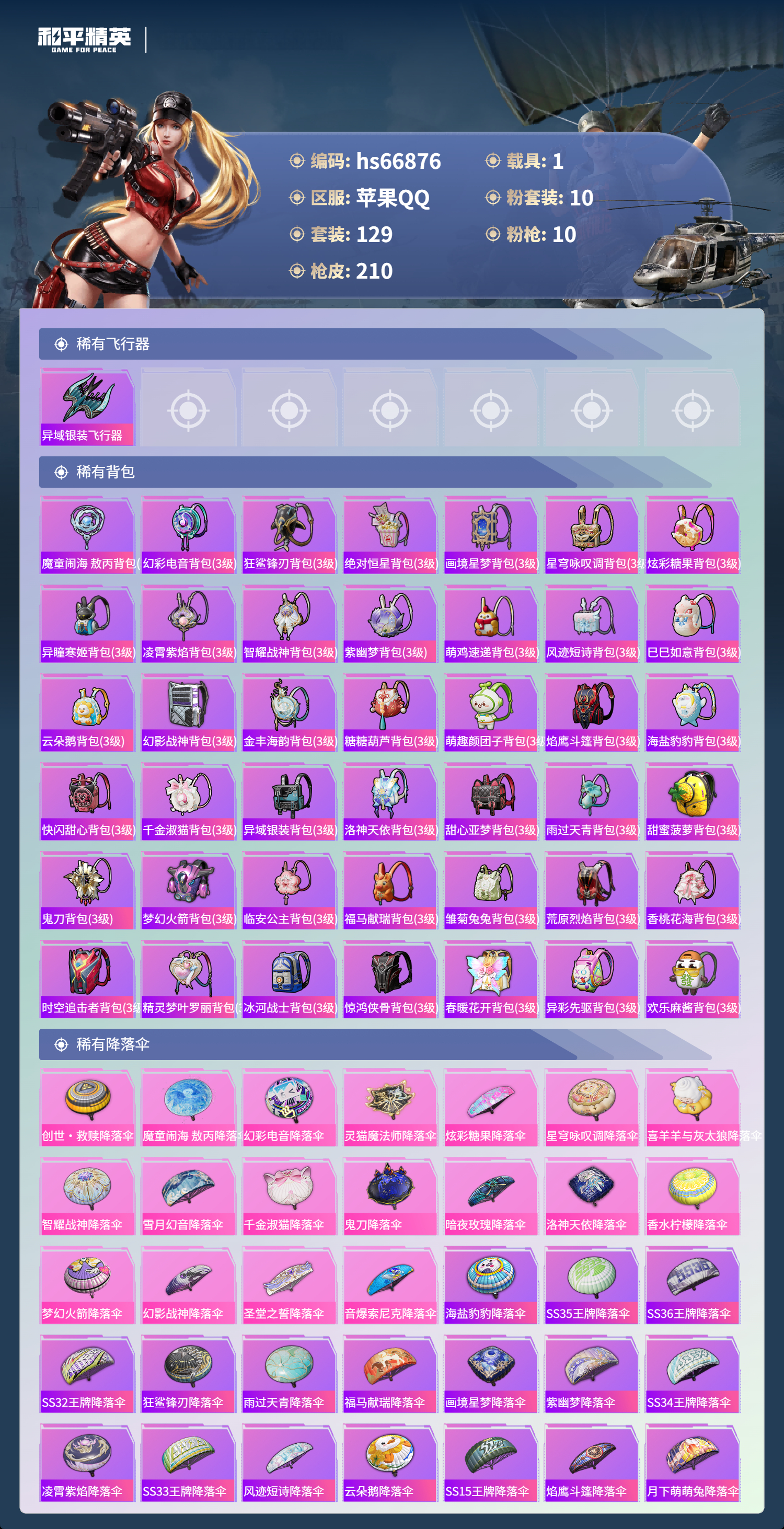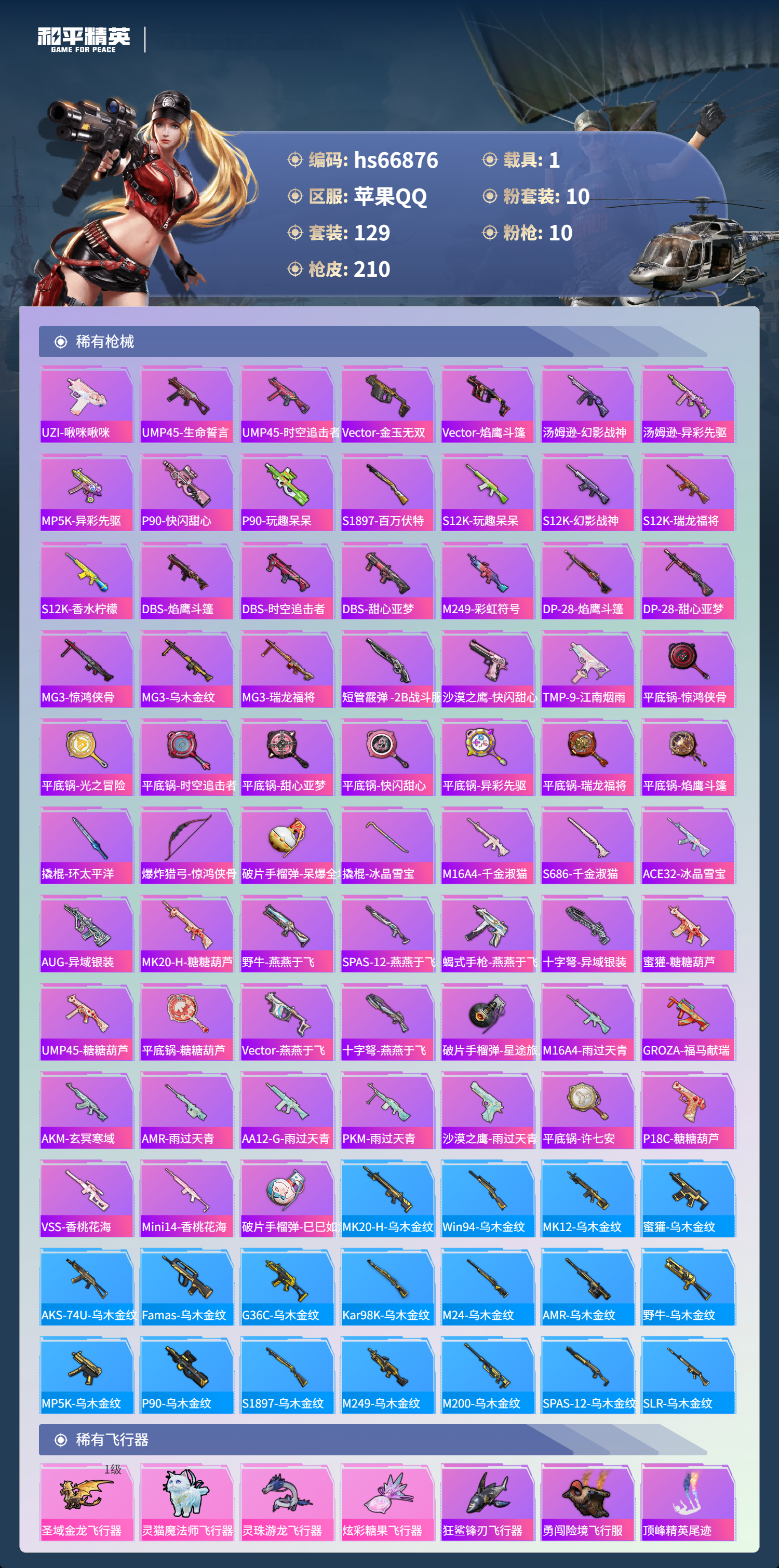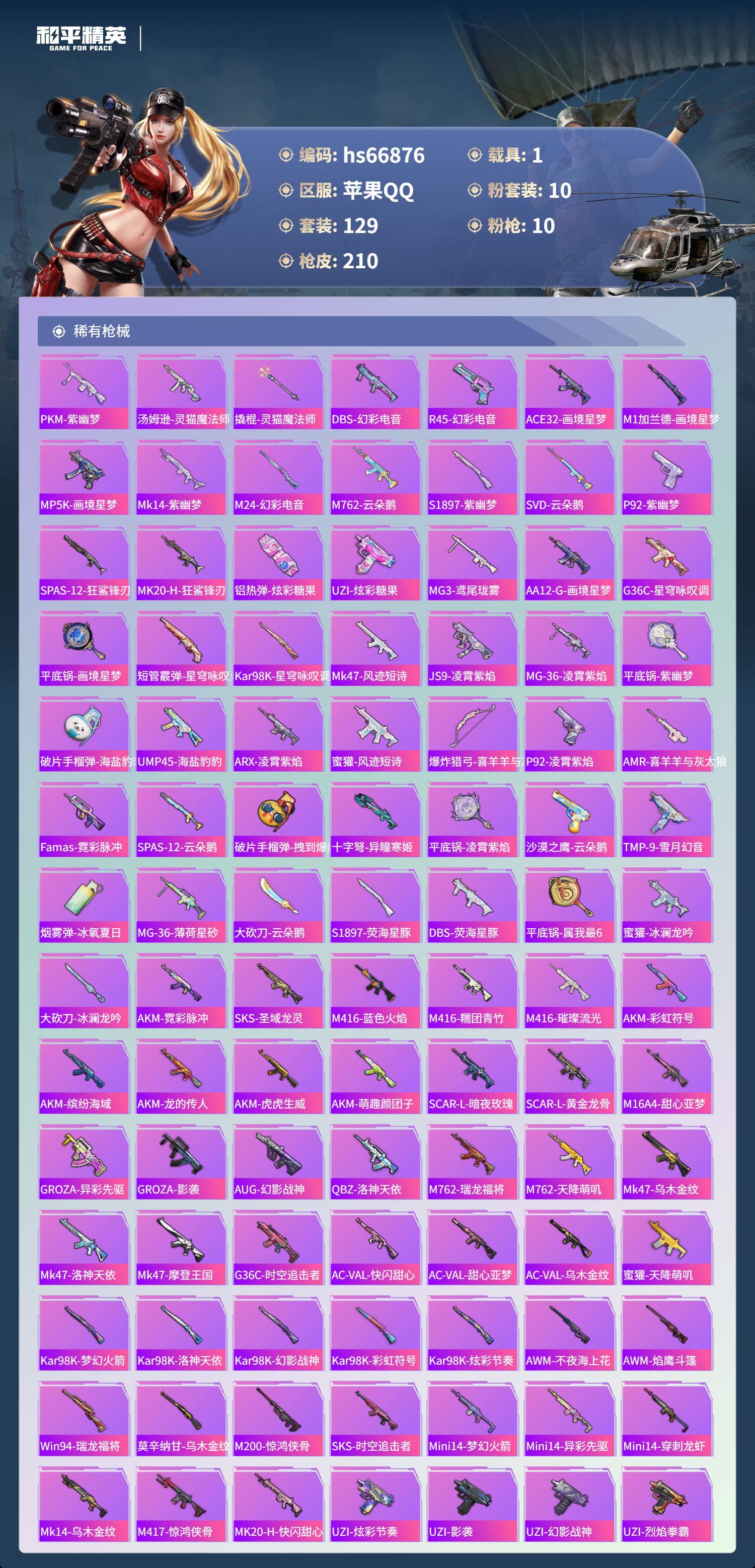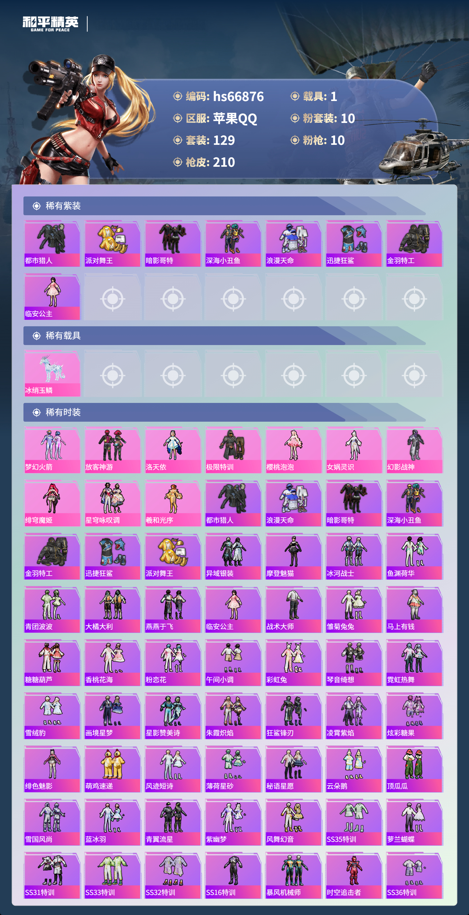 hs66876 苹果手Q-24王牌印记-有战神框-10粉装-10特效枪-1载具-71338热力值-129套装-210枪皮-5卓越印记-2传奇印记