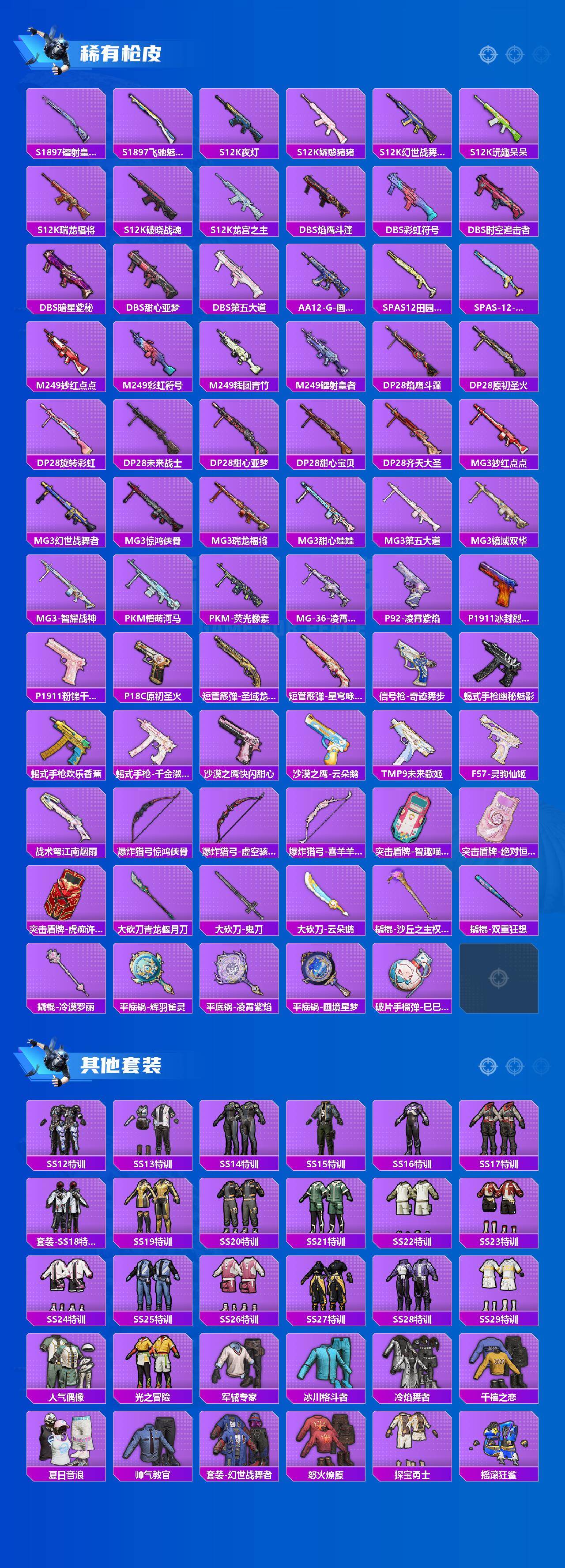 苹果 手Q-3神装-21粉装-17特效枪-9载具-19粉色飞行器-163623热力值-21王牌印记-321套装-452枪皮