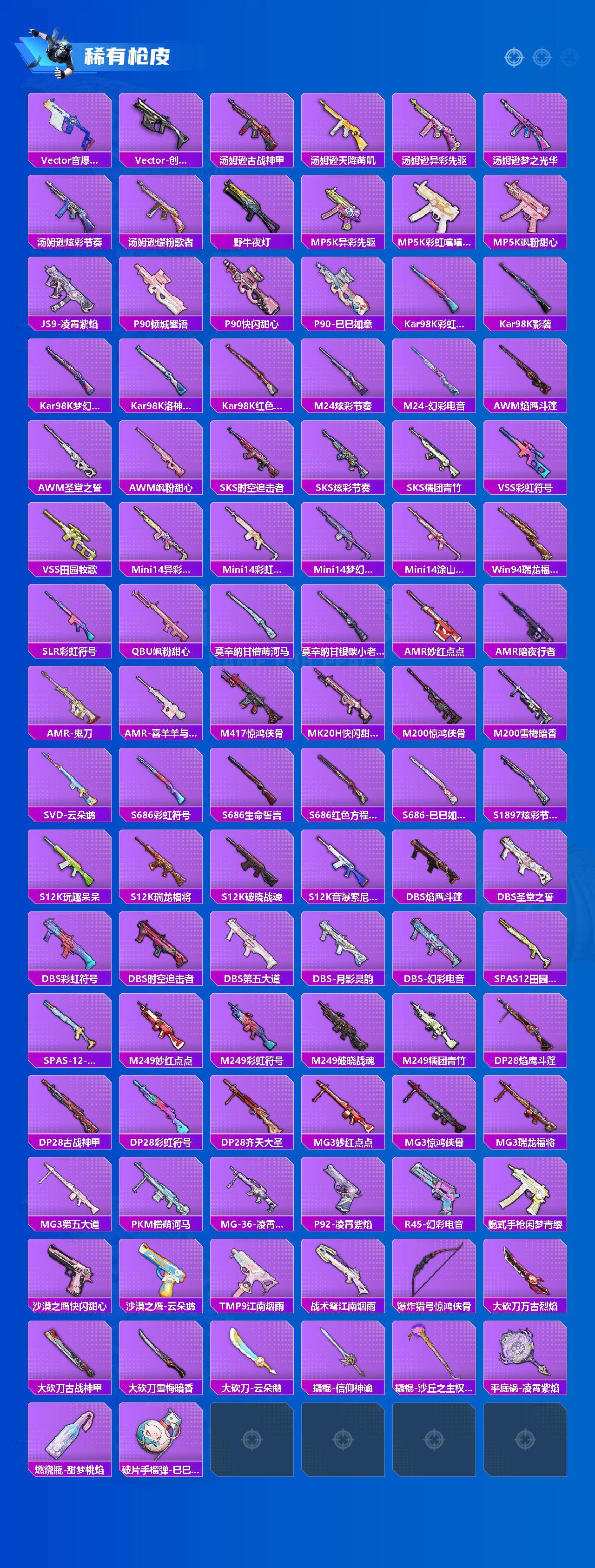 苹果 手Q-1神装-25粉装-13特效枪-7载具-7粉色飞行器-112214热力值-14王牌印记-218套装-294枪皮