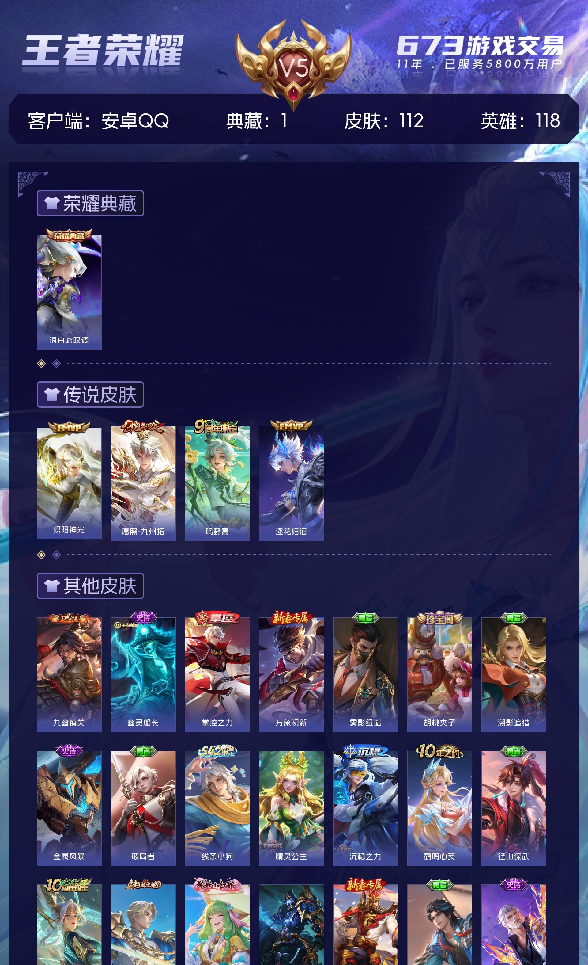 V5 皮肤112 英雄118 最强王者 荣耀典藏1 传说4