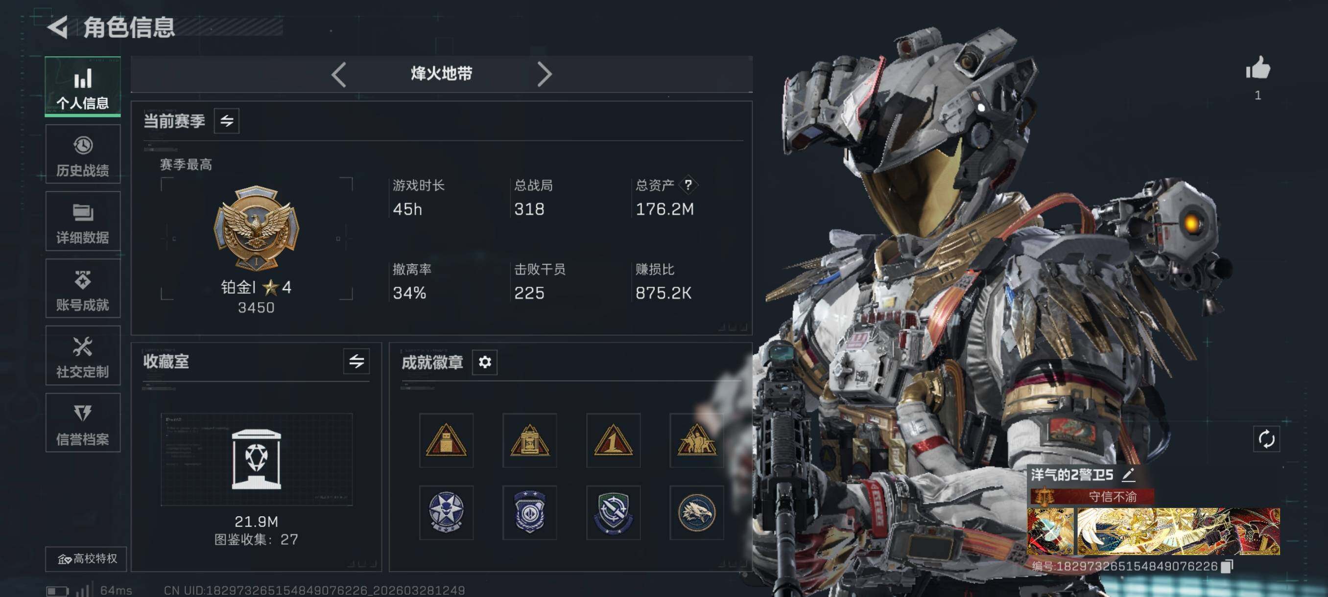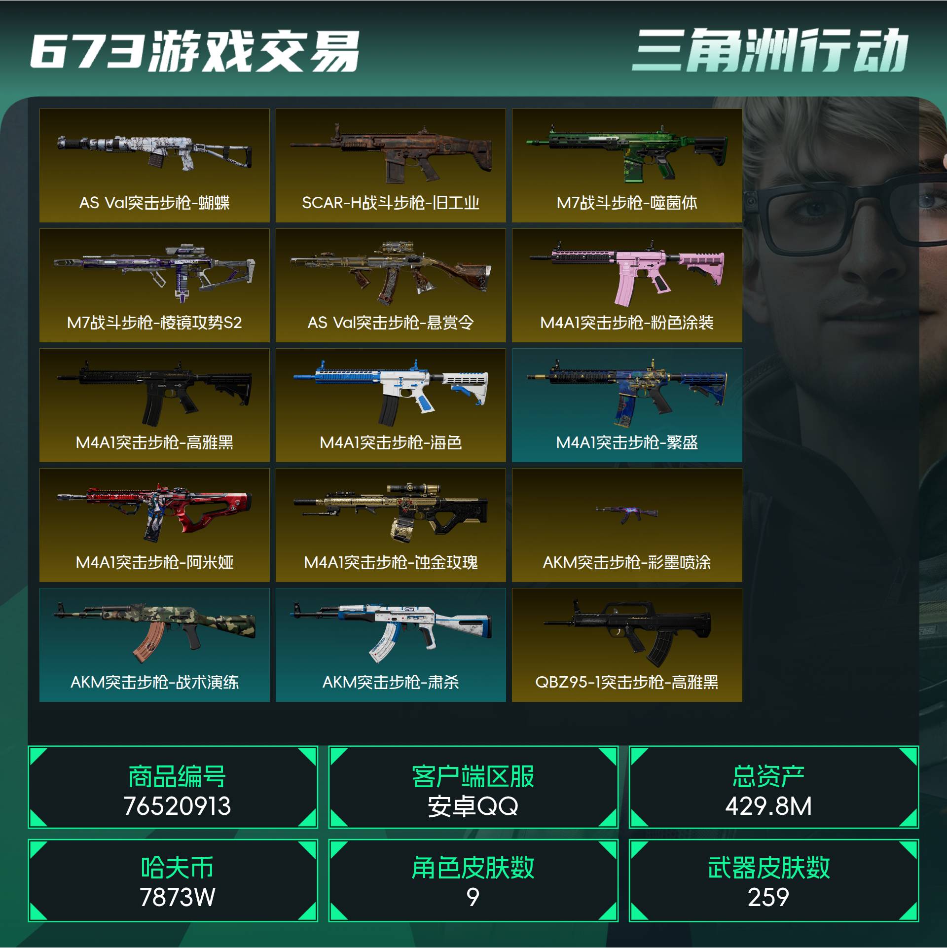 {特价出售}等级:60 总资产:176.2M 纯币45736k 隐藏挂饰:非洲之心 红皮:凌霄戍卫,黑天际线,午夜邮差 刀皮:暗星,信条,龙牙,影锋,怜悯,赤枭 特勤处:仓库8,训练7,靶场7