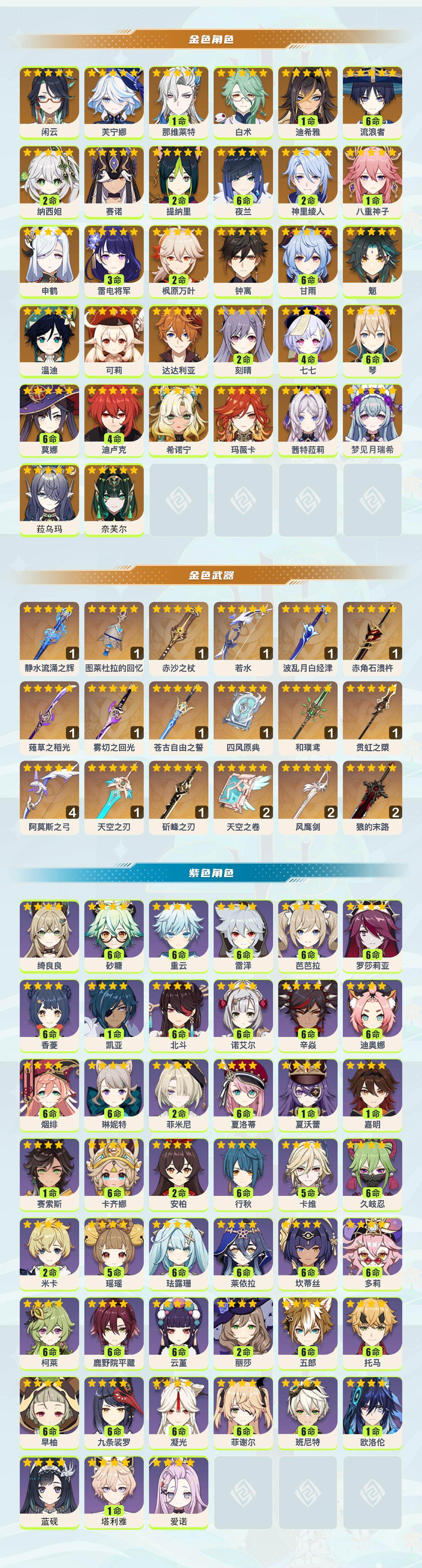 【金色角色】:奈芙尔(0命),菈乌玛(0命),梦见月瑞希(0命),玛薇卡(0命),茜特菈莉(0命),希诺宁(0命),闲云(0命),芙宁娜(0命),那维莱特(1命),白术(0命),迪希雅(1命),流浪者(满命),纳西妲(2命),赛诺(0命),提纳里(2命),夜兰(满命),神里绫人(2命),八重神子(1命),申鹤(0命),雷电将军(3命),枫原万叶(2命),魈(0命),甘雨(满命),钟离(0命),达达利亚(0命),可莉(0命),温迪(0命),琴(满命),刻晴(2命),迪卢克(4命),莫娜(满命),七