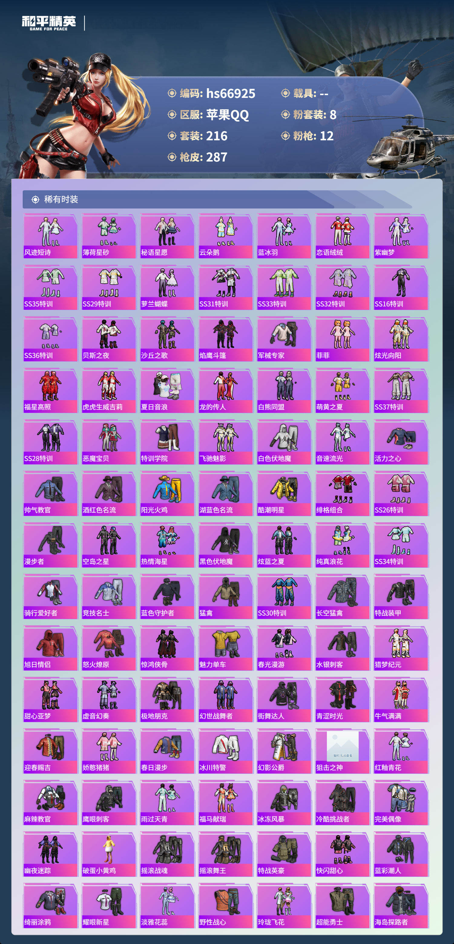 hs66925 苹果手Q-20王牌印记-有战神框-8粉装-12特效枪-90873热力值-216套装-287枪皮-6卓越印记-6传奇印记