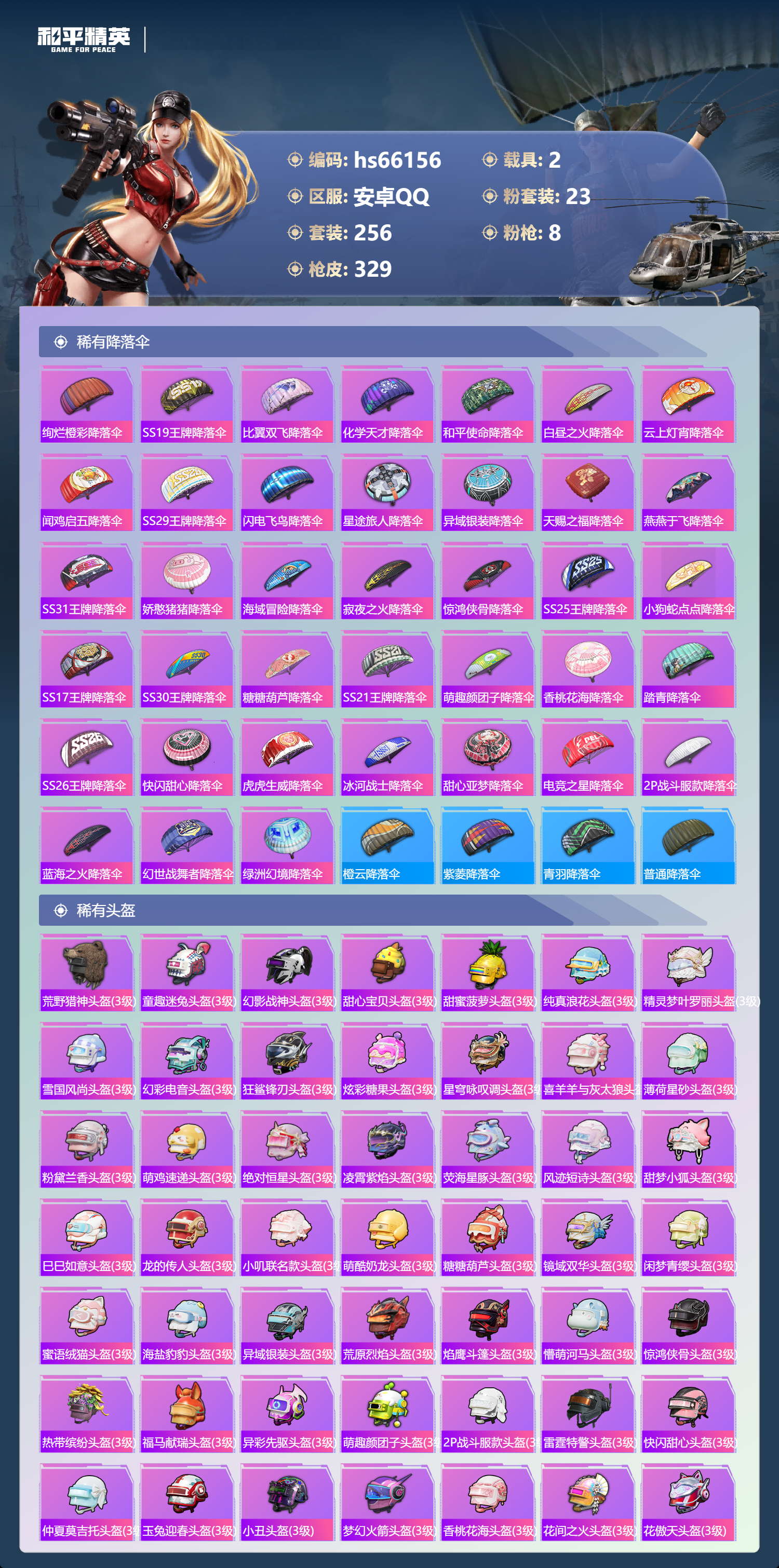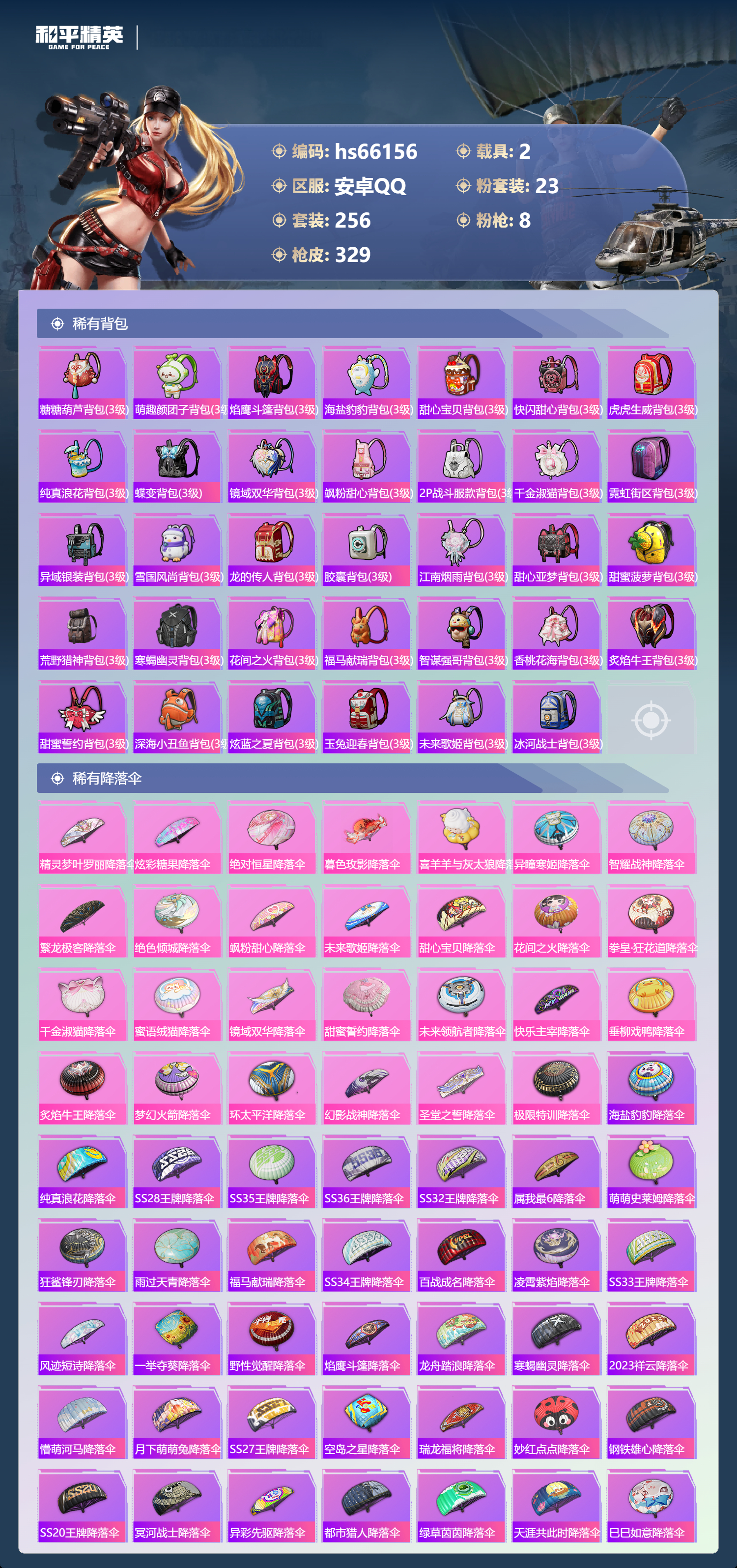 hs66156 安卓手Q-18王牌印记-23粉装-8特效枪-2载具-热力值-256套装-329枪皮-3卓越印记