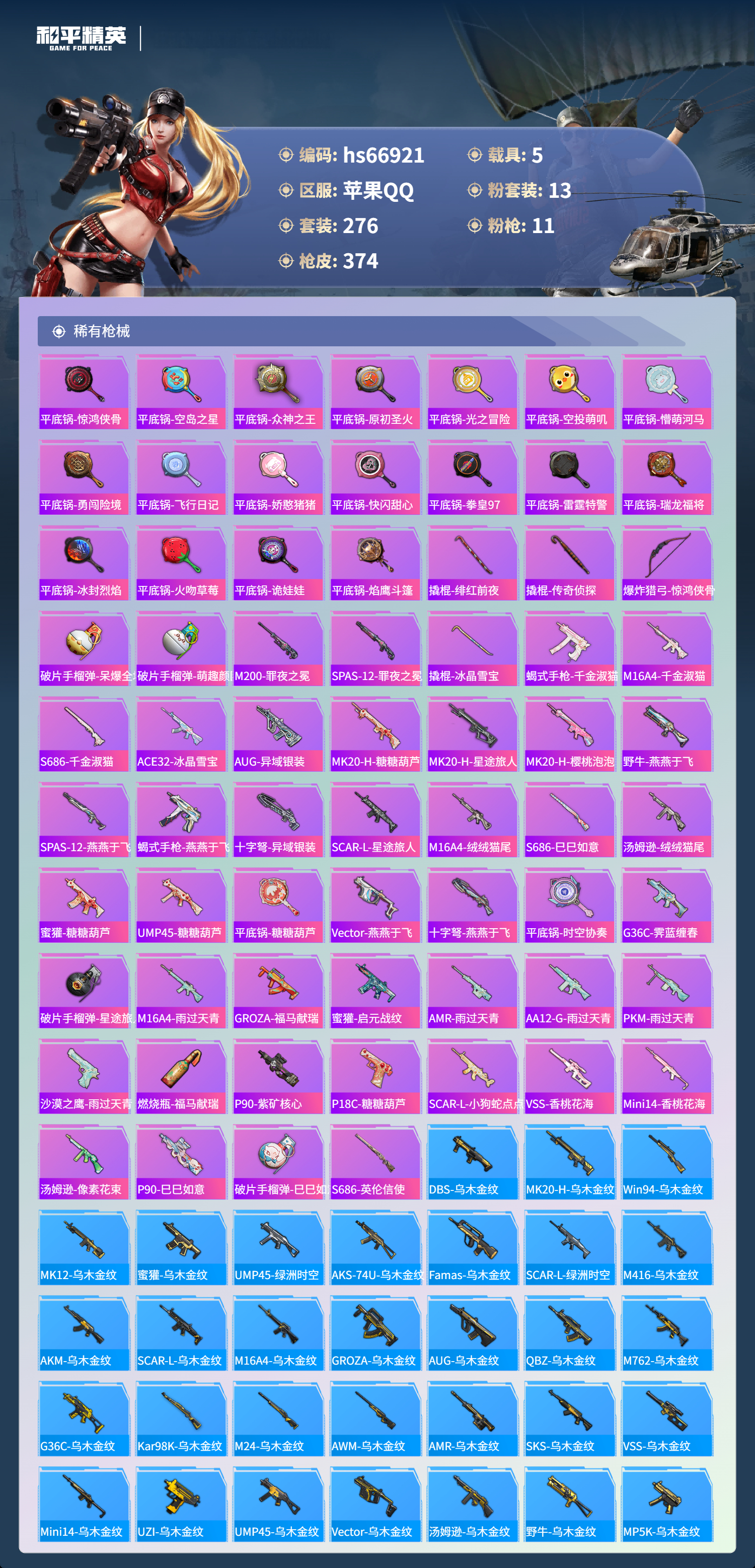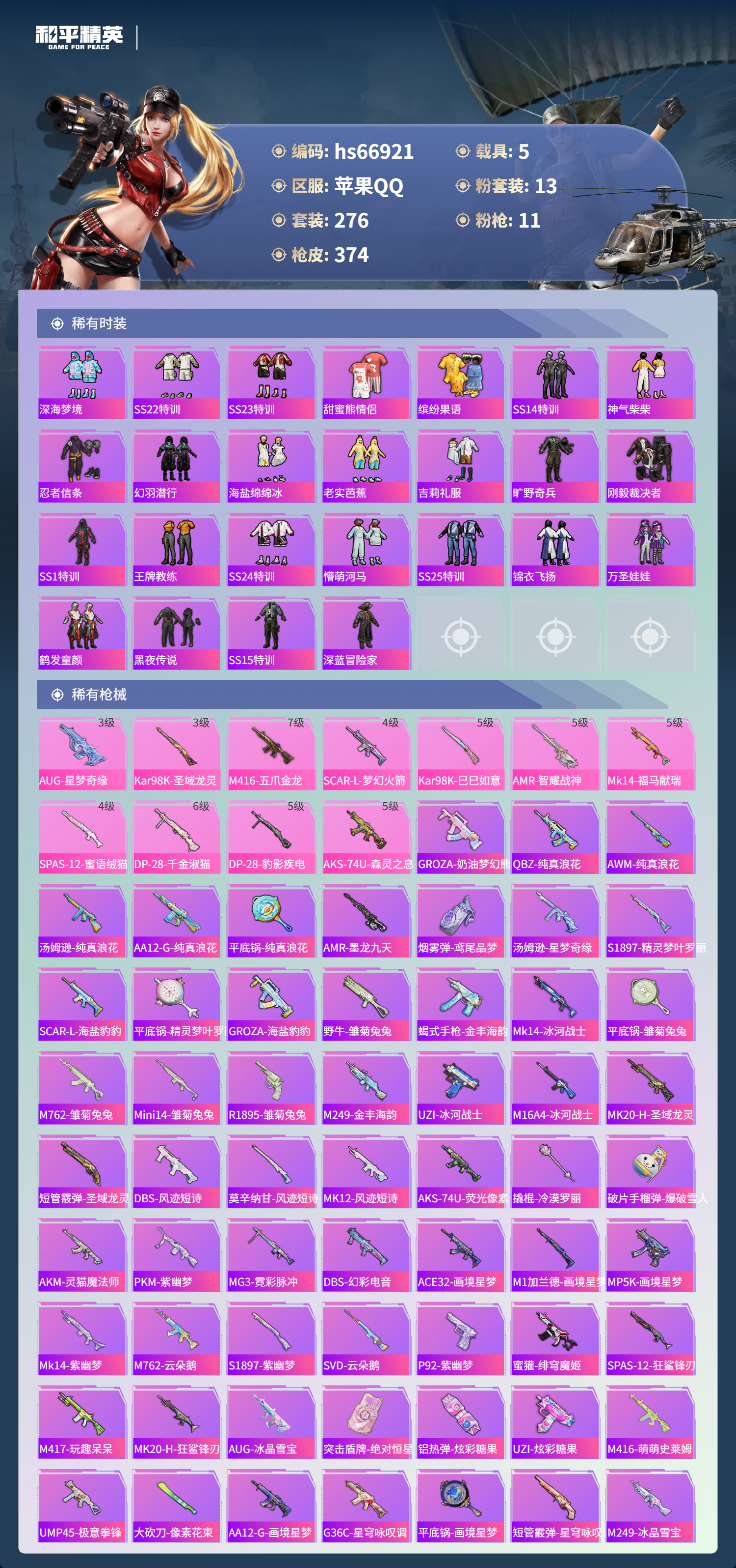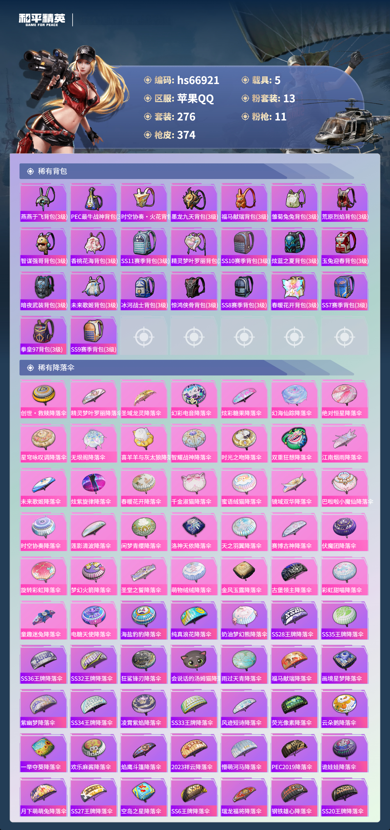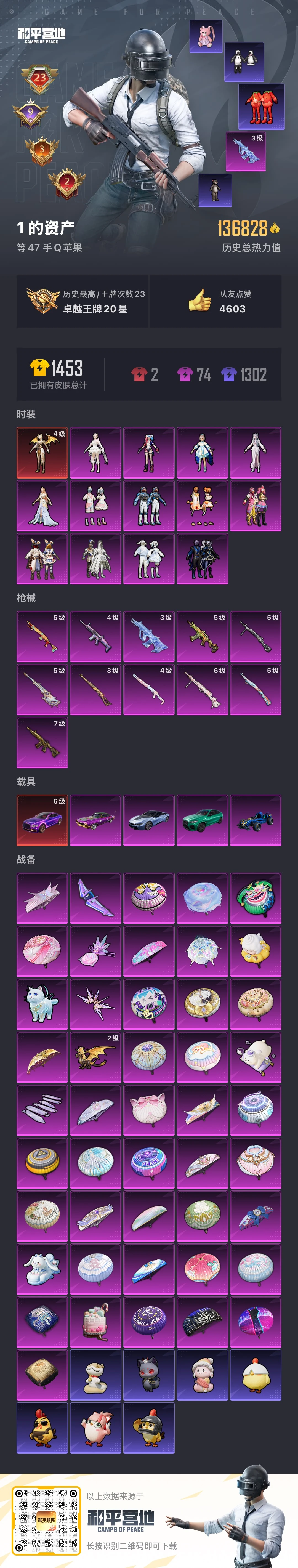 苹果手Q-23王牌印记-1红装-13粉装-11特效枪-5载具-热力值-276套装-374枪皮-9卓越印记-3传奇印记