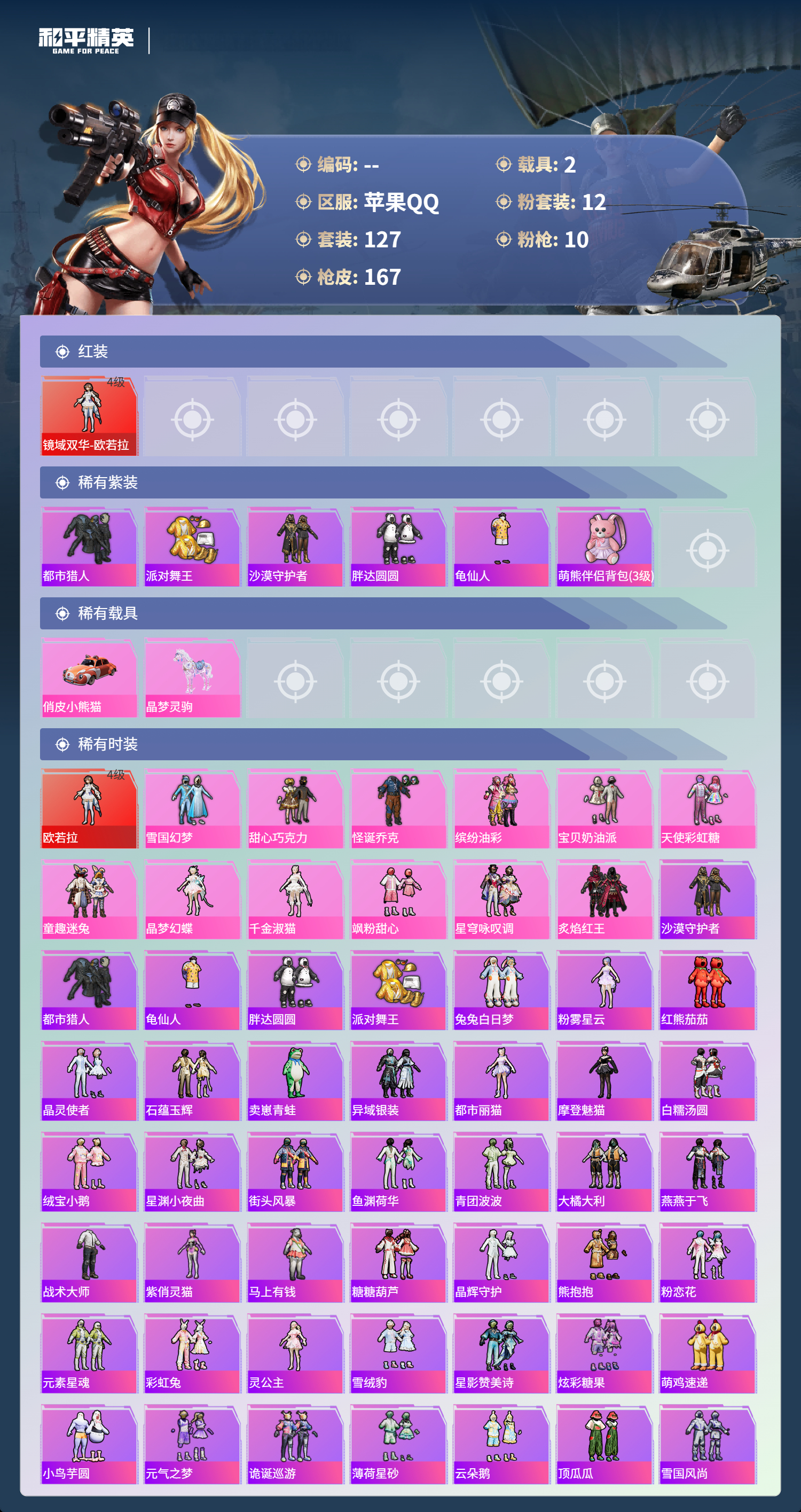 hs66932 苹果手Q-13王牌印记-1红装-12粉装-10特效枪-2载具-64563热力值-127套装-167枪皮-7卓越印记-2传奇印记