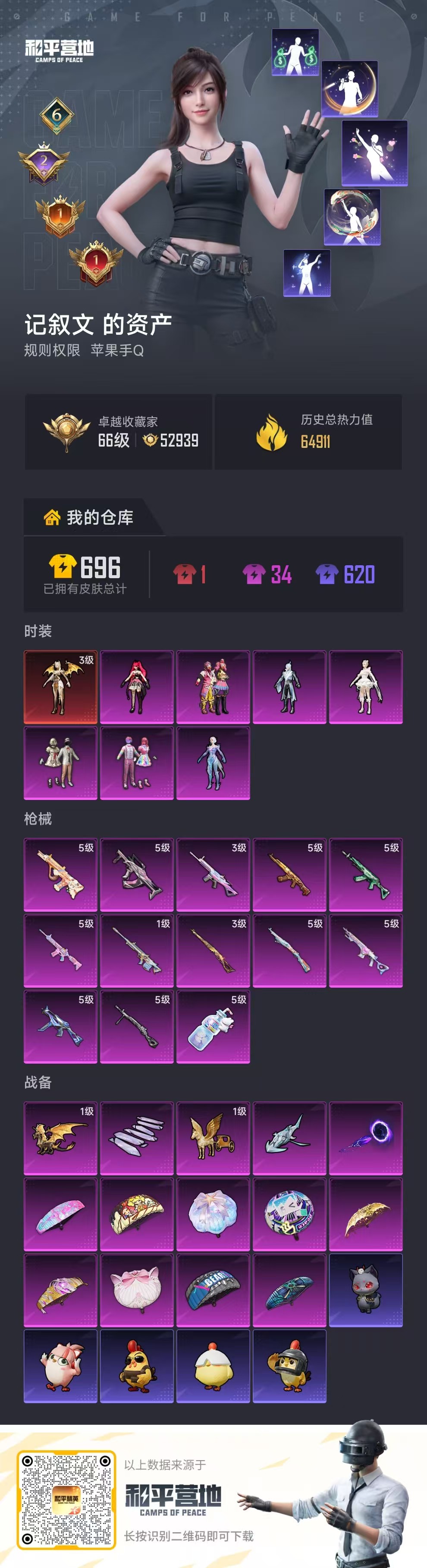 6王牌印记-有战神框-1红装-7粉装-13特效枪-64911热力值-132套装-206枪皮-2卓越印记-1传奇印记