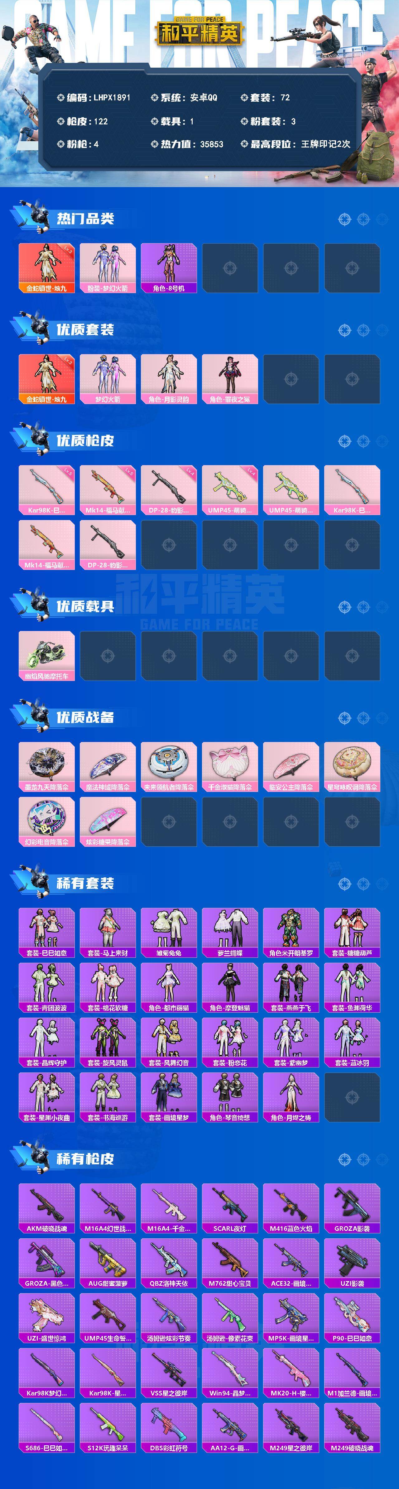 可二次【特价出售/店主推荐】安卓 手Q-1神装-3粉装-4特效枪-1载具-35853热力值-2王牌印记-72套装-122枪皮【红色神装等级】:金蛇镇世-烛九(三级)【热门品类】:粉装-梦幻火箭,角色-8号机【粉色套装】:粉装-梦幻火箭,角色-月影灵韵,角色-罪夜之冕【粉色枪皮等级】:UMP45-萌骑冒险(四级),Kar98K-巳巳如意(五级),Mk14-福马献瑞(五级),DP-28-豹影疾电(四级)【粉色载具】:幽焰风驰摩托车