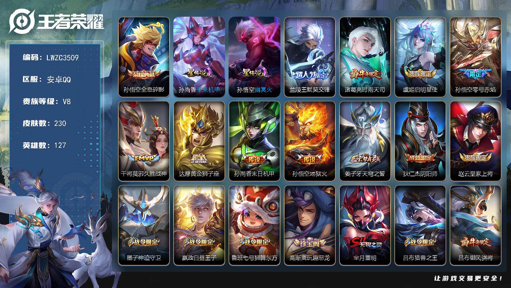【特价急出/详情看图】安卓Q-V8-最强王者段位-127英雄-230皮肤-1典藏皮肤-2星元-8传说-69史诗【荣耀典藏】:孙悟空全息碎影【传说皮肤】:兰陵王默契交锋,诸葛亮时雨天司,虞姬启明星使,孙悟空零号赤焰,干将莫邪久胜战神,达摩黄金狮子座,孙尚香末日机甲,孙悟空地狱火【限定皮肤】:姜子牙天穹之誓,狄仁杰阴阳师,赵云皇家上将,墨子神迹守卫,嬴政白昼王子,鲁班七号狮舞东方,高渐离玩趣恶龙,芈月重明,吕布猎兽之王,吕布御风骁将,周瑜赤莲之焰,元歌云间偶戏,夏侯惇朔风刀,典韦穷奇,典韦蓝屏警告,