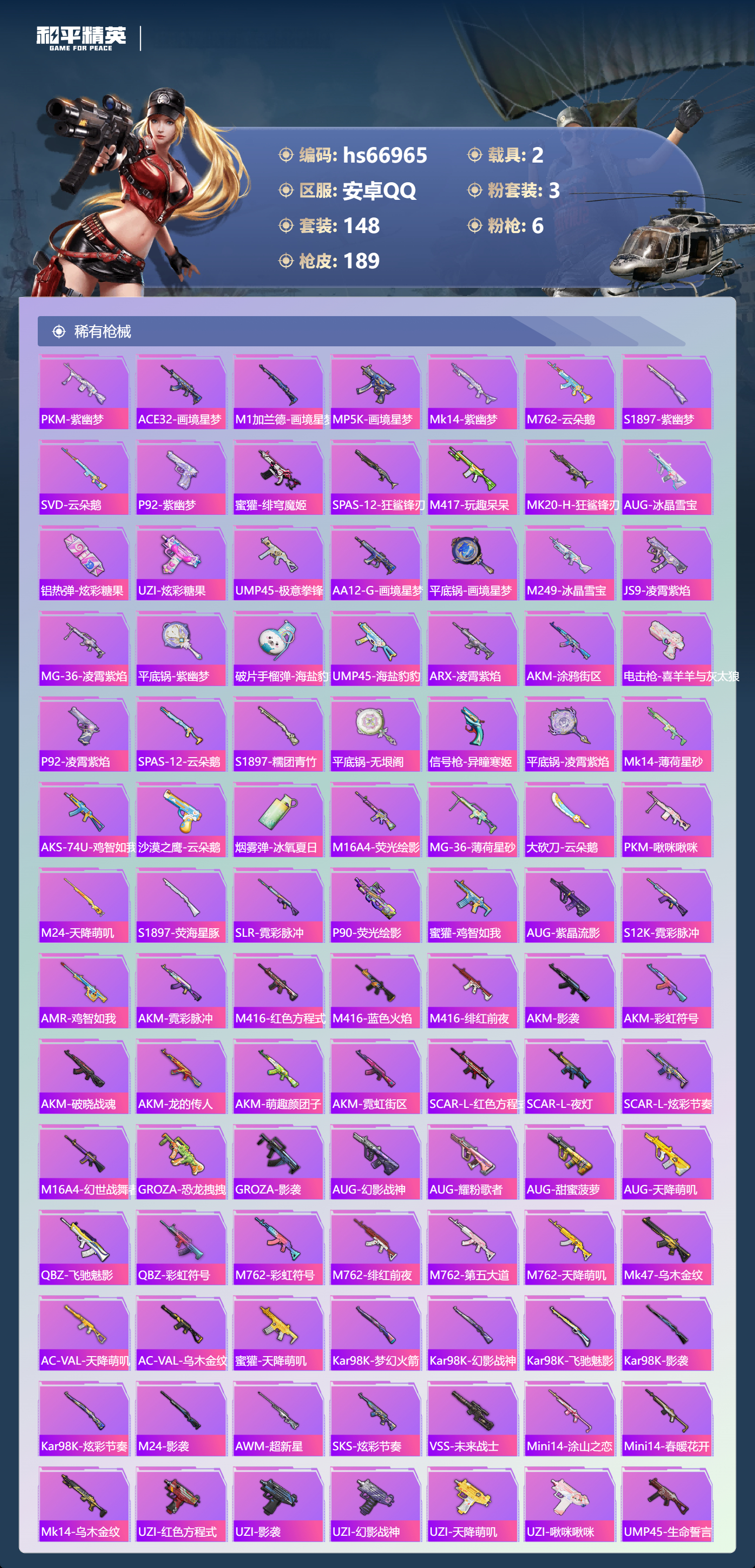 hs66965 安卓手Q-8王牌印记-3粉装-6特效枪-2载具-54141热力值-148套装-189枪皮-2卓越印记-1传奇印记