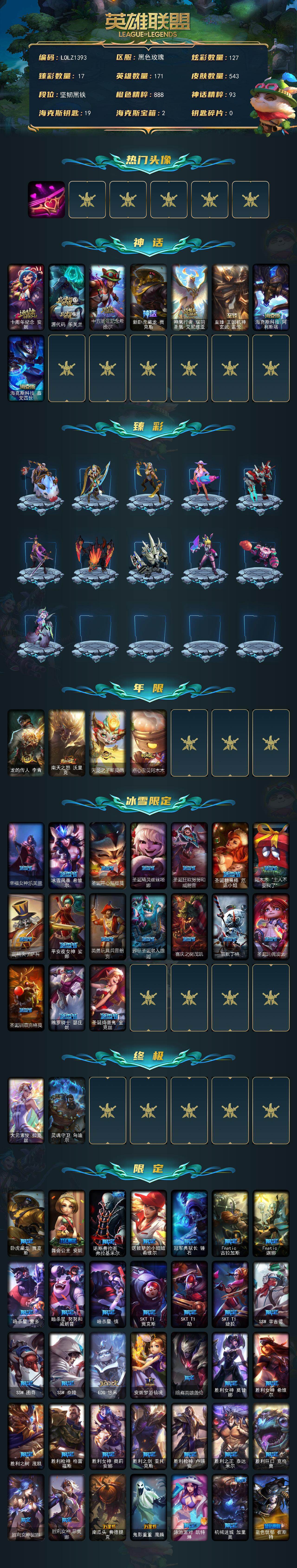 【LOLZ1393】171英雄/543皮肤/2终极/8神话/74限定/17臻彩/127炫彩/41传说/144史诗/未定级/爱情之歌头像/十周年纪念安妮/源代码乐芙兰/十五周年纪念希维尔/新卧虎藏龙贾克斯/神凰行者瑞羽圣凰艾尼维亚/至臻王国机神玄武盖伦/海克斯科技阿利斯塔/海克斯科技嘉文四世/天龙之子卡莎飞龙乘云/无畏骑士瑟庄妮赤子初心/冠军之箭艾希凯旋圣装/墨之影武者亚索金墨耀影/闭月之颜貂蝉炫金莲华/泳池派对凯特琳粉红冰川/霸天战士雷恩加尔星啸天火/玉剑传说无极麒麟/星之守护者娑娜未来之光/山
