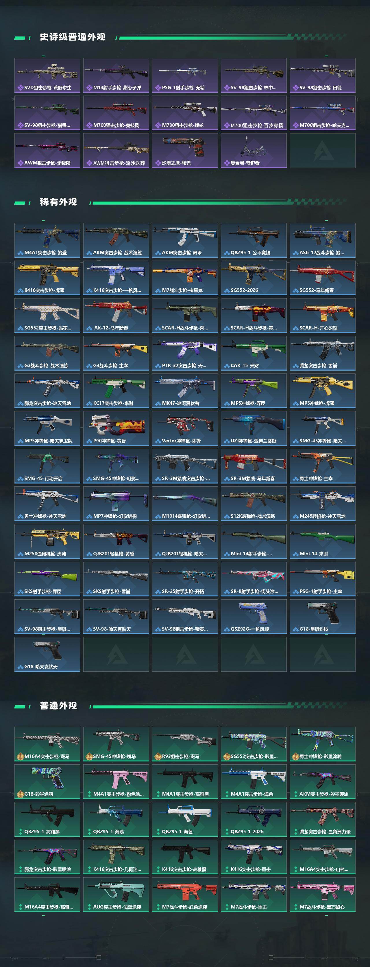 【传说外观】:M4A1突击步枪-阿米娅,AKM突击步枪-锦绣,QBZ95-1突击步枪-凌霄戍卫,K416