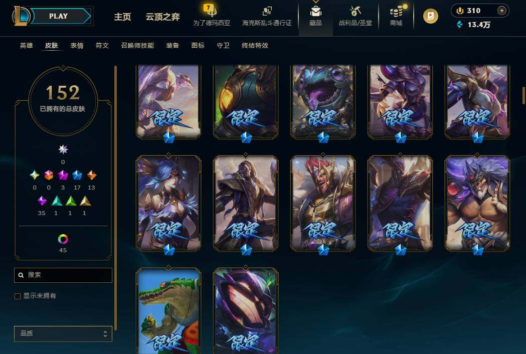 172英雄/152皮肤/3神话/17限定/2臻彩/49炫彩/14传说